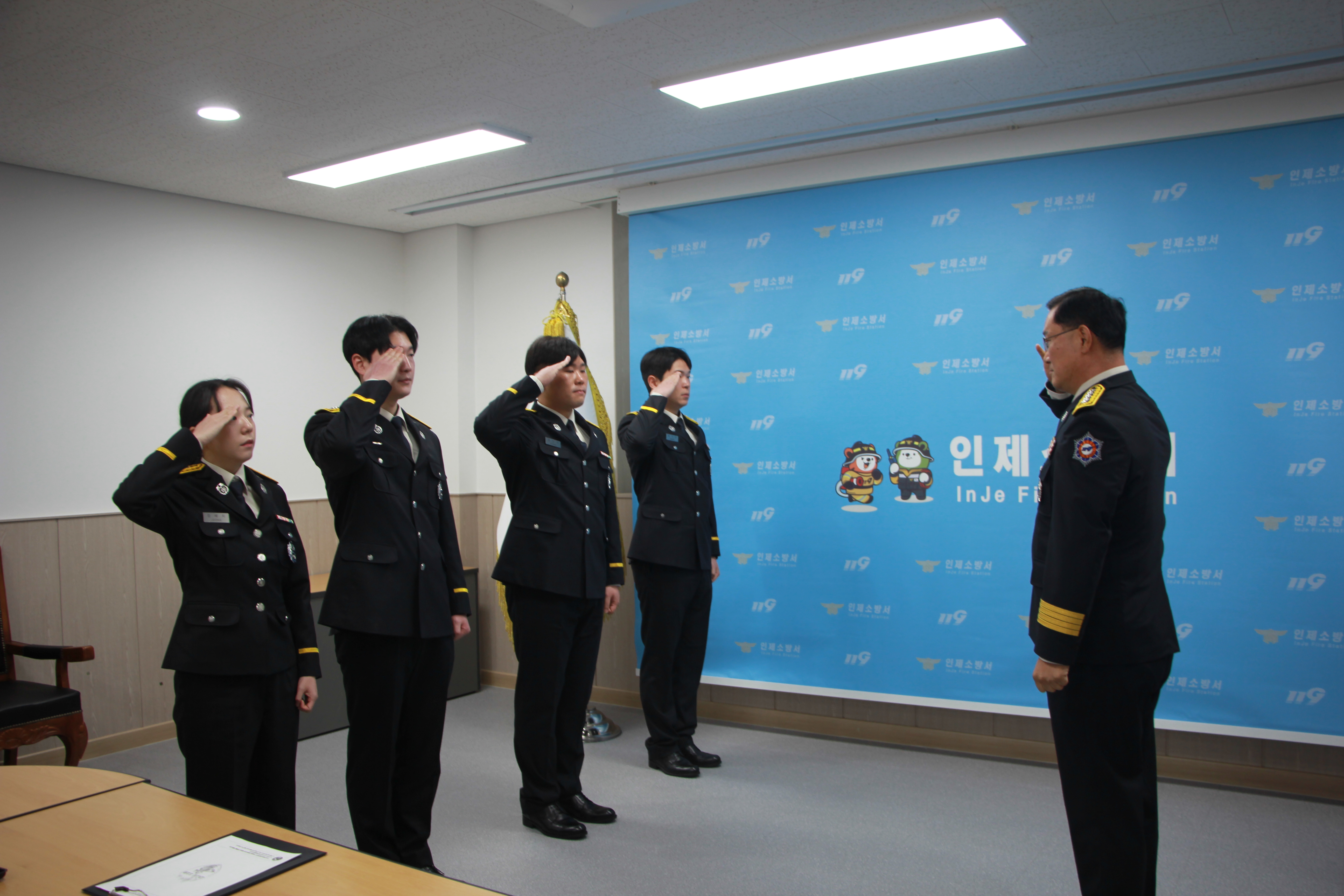 인제소방서(서장 최영철)는 26일 오전 인제소방서 소회의실에서 신규 임용 소방공무원에 대한 임용식을 실시했다고 밝혔다. 이날 임용식은 신규임용자 4명(정혜지·손형우·경인구·권구인)을 대상으로 진행했다.