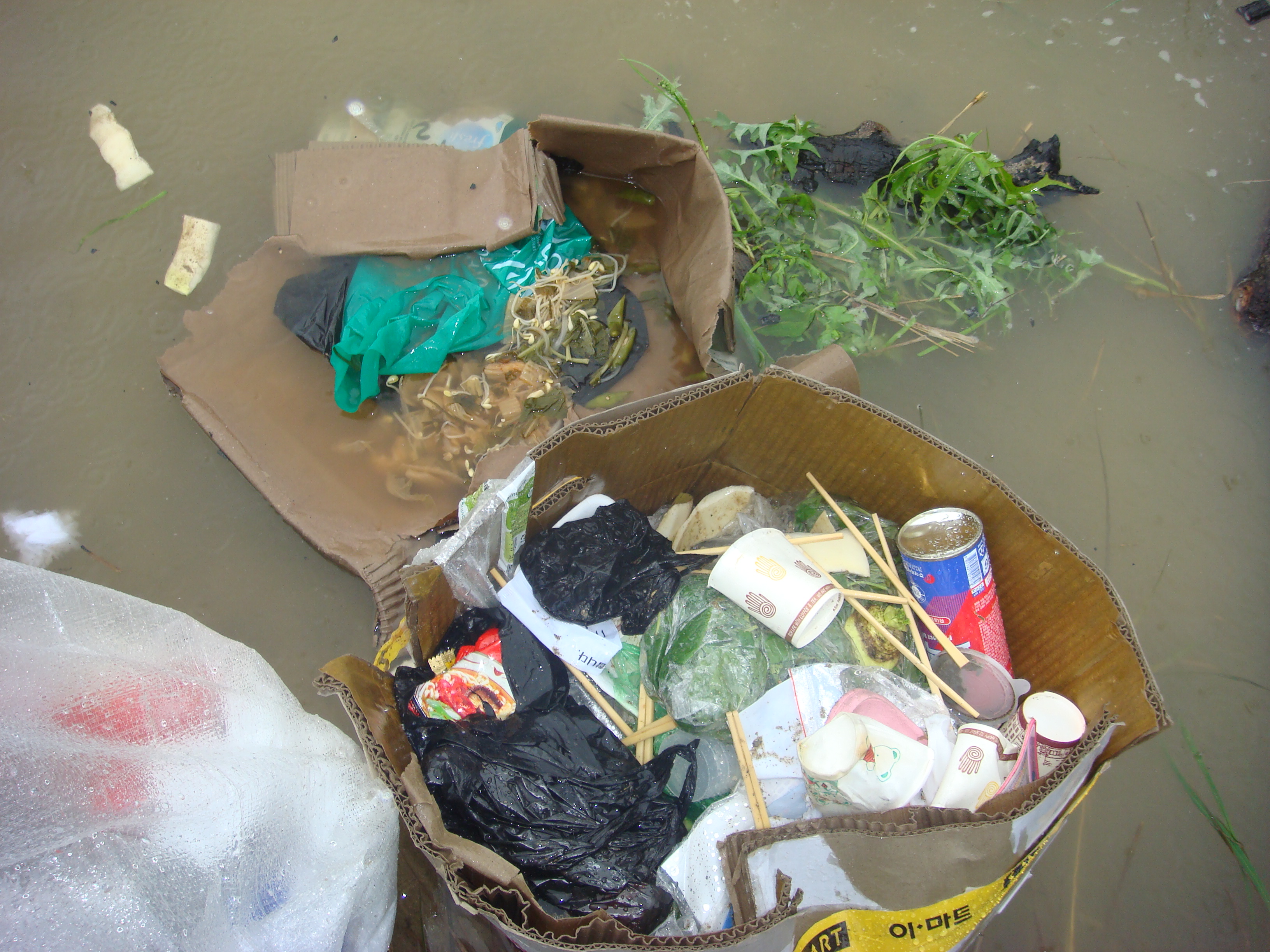 피서객들이 버리고간 쓰레기가 강물이 늘어나 떠내려갈