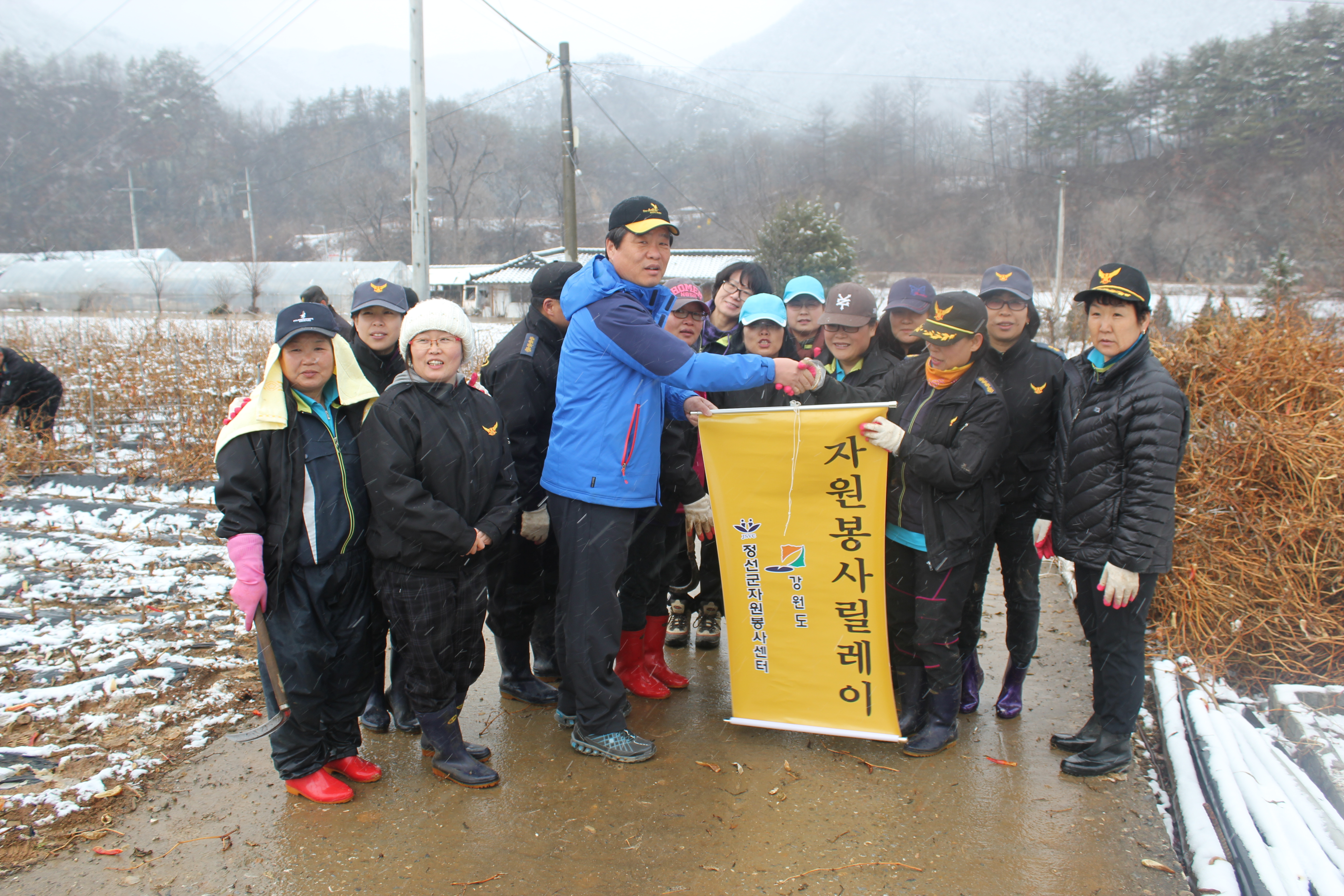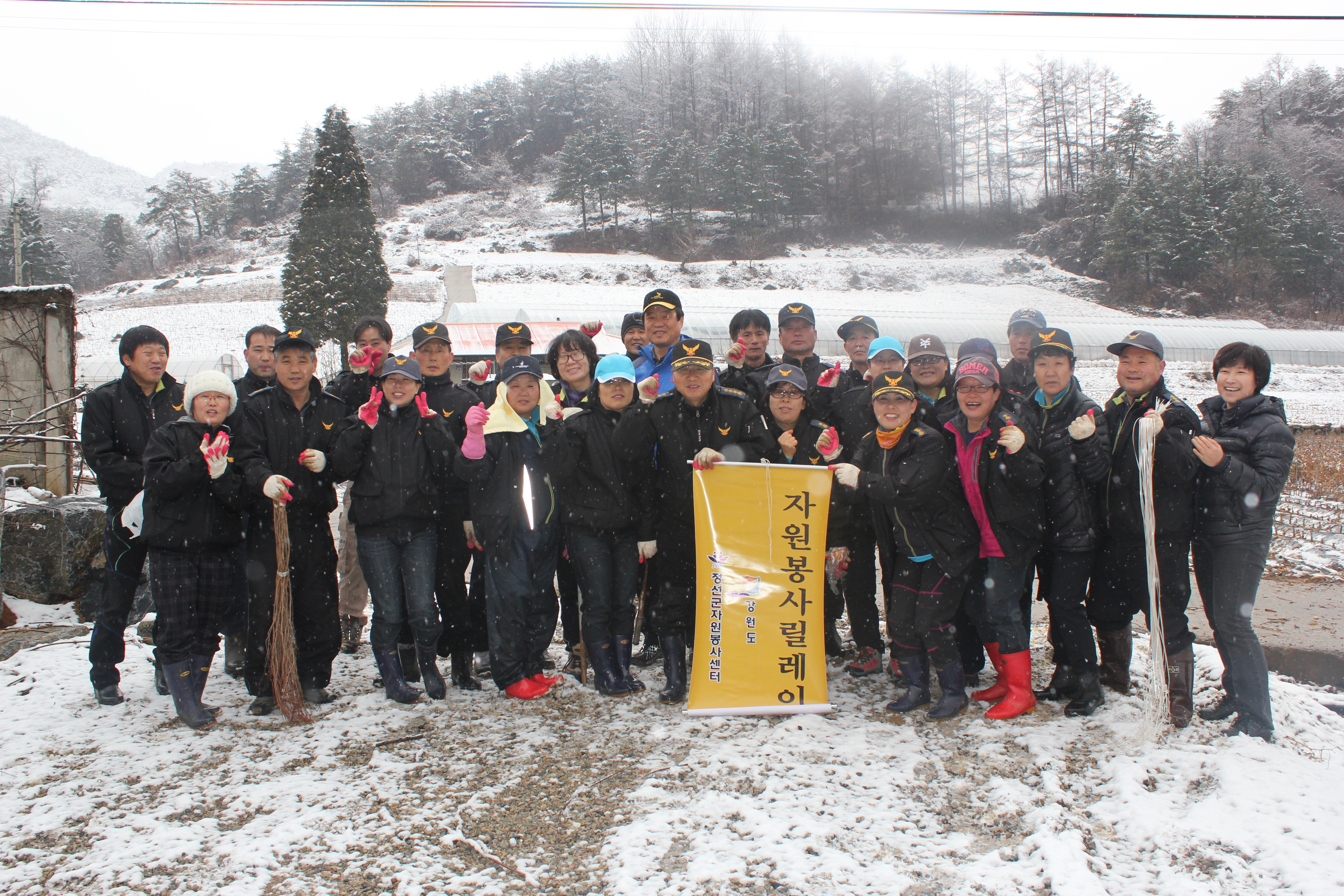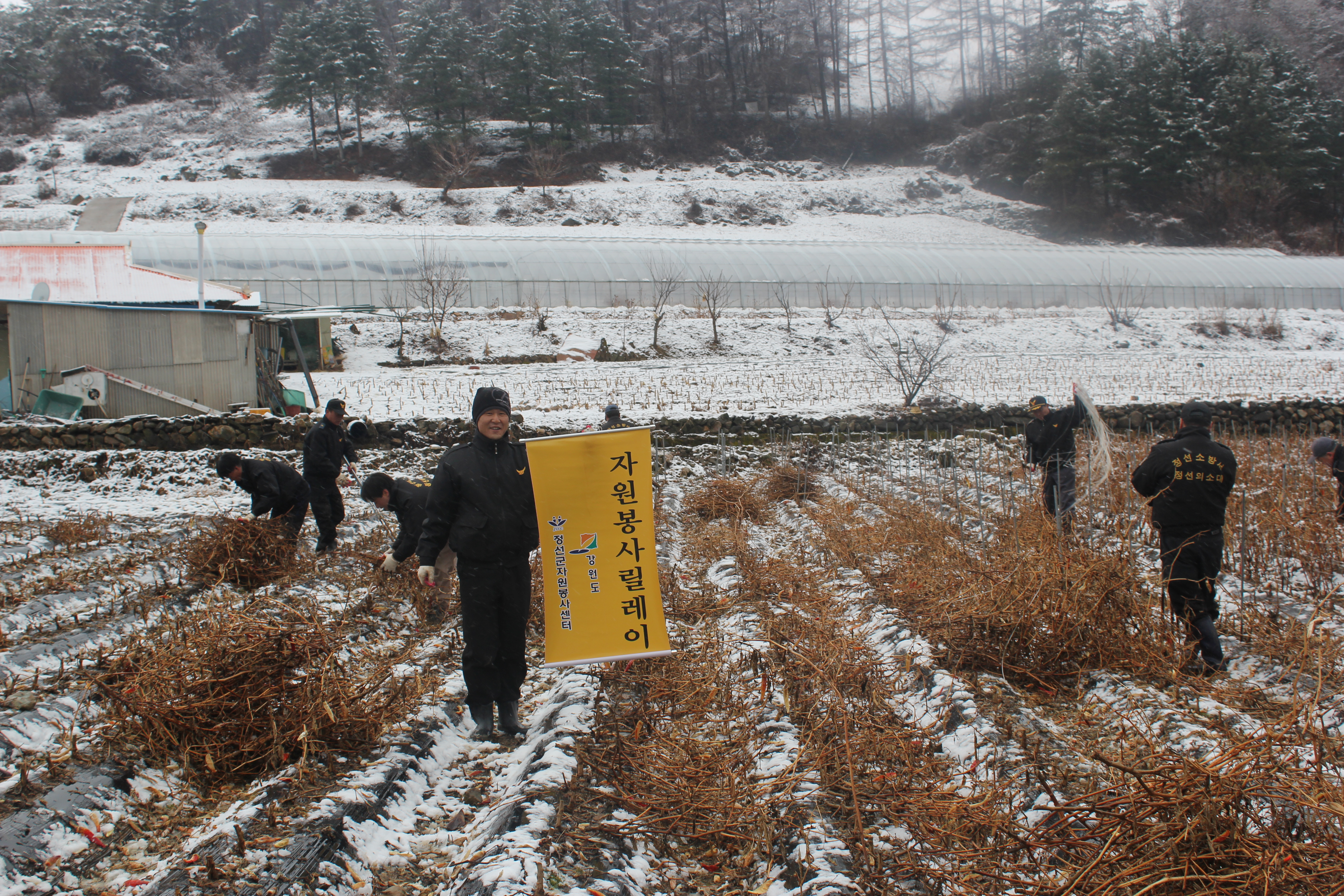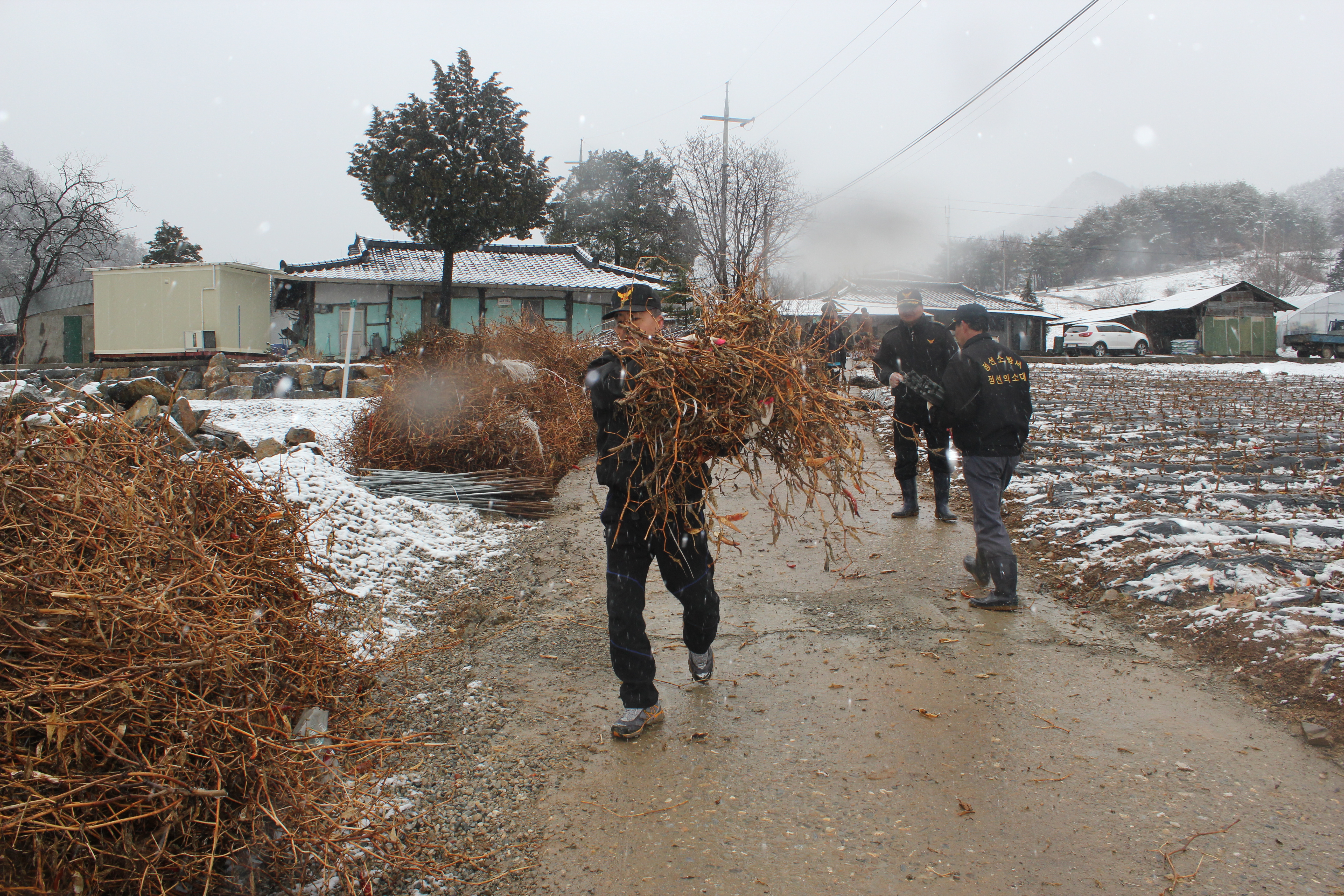 정선의용소방대(대장:박진호) 정선여성의용소방대(대장:장순자)는 3월24일 자원봉사 릴레이행사로 많은 눈이 내리는 일기에도 40여명의 대원들은 정선읍 덕우리 한농가에서 농촌일손돕기를 하였습니다