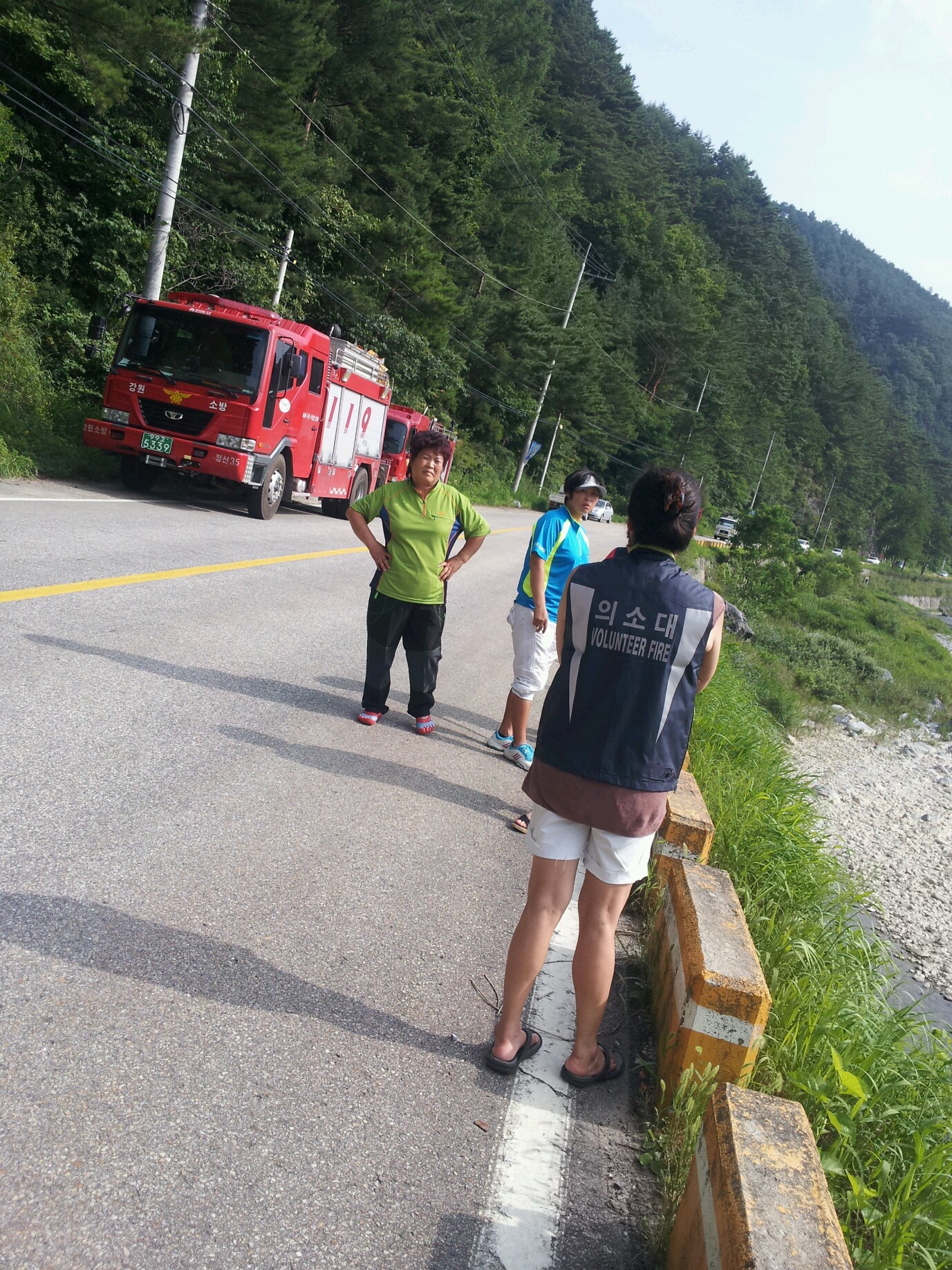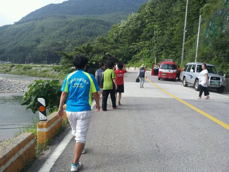 지난7월 28일(토) 여량면 유천3리 마을관리 휴양지 송천에서 발생한 수난구조현장에 현장출동중인 정선소방서 119구조대의 원할한 구조활동을 위해 교통정리등 구조활동 보조함.