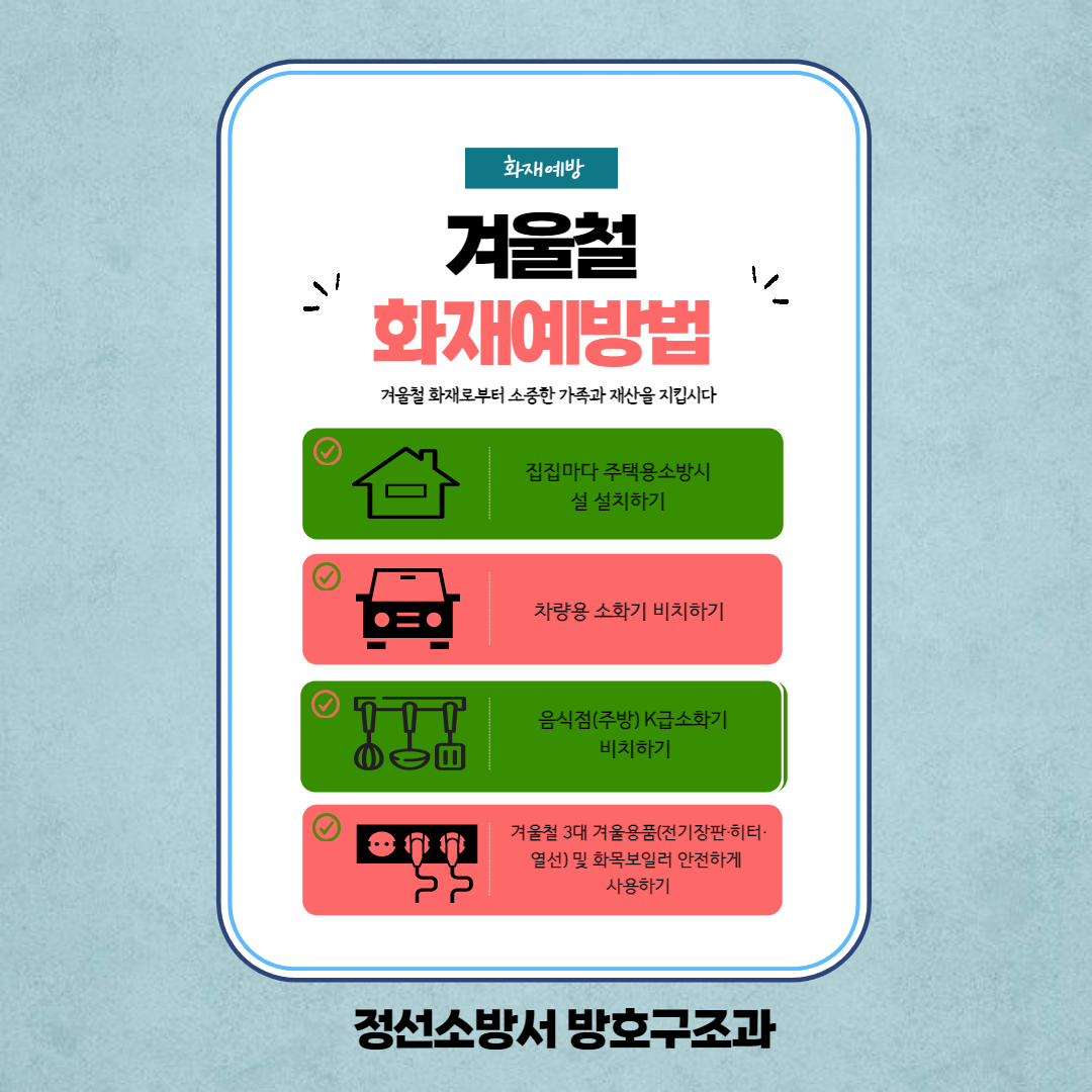 | 1214 | 정선소방서, 겨울철 3대 전기제품 안전사용 당부 | 지역소방서 | 2022-01-28 | 624 | |