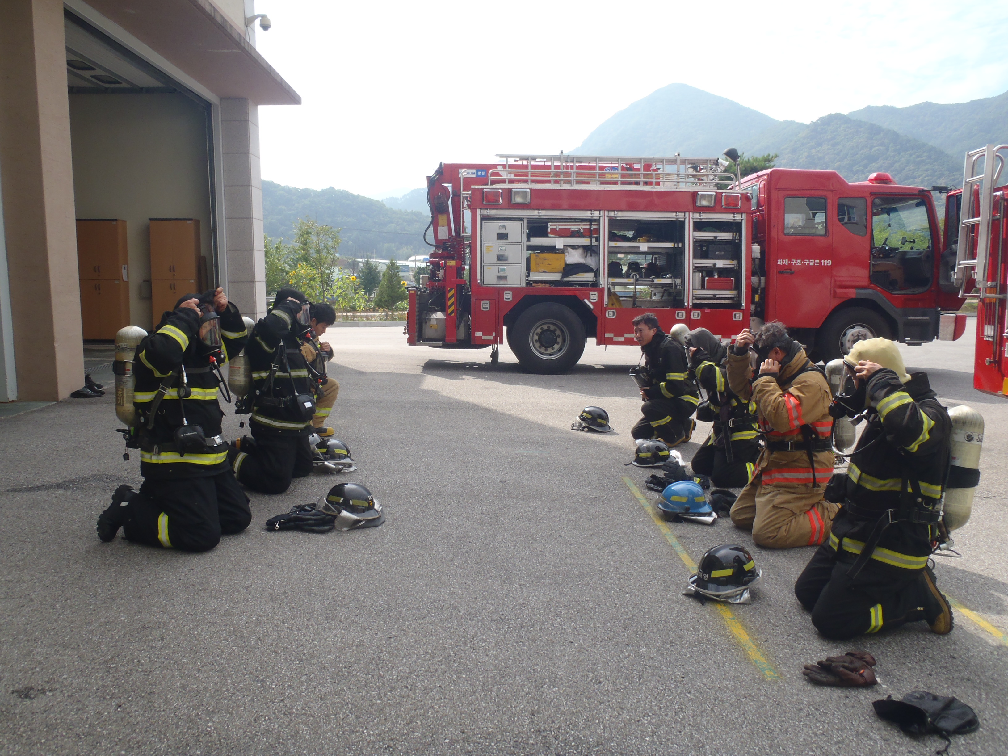 정선소방서(서장 이병광) 방호구조과 구조진압대는 2012년 9월26일 10시부터 청사 후정에서 공기호흡기 장착 및 탈착 훈련 실시하였습니다