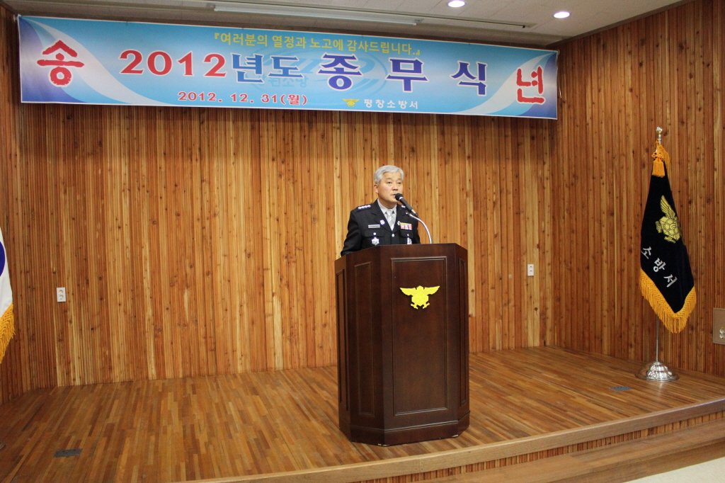 평창소방서(서장 김용락)은 31일(월) 오전 11시 평창소방서 대회의실에서 2012년 종무식을 개최하였다. 유공자 표창을 비롯하여 다과를 통해 올 한해를 마무리 하는 자리가 되었다.