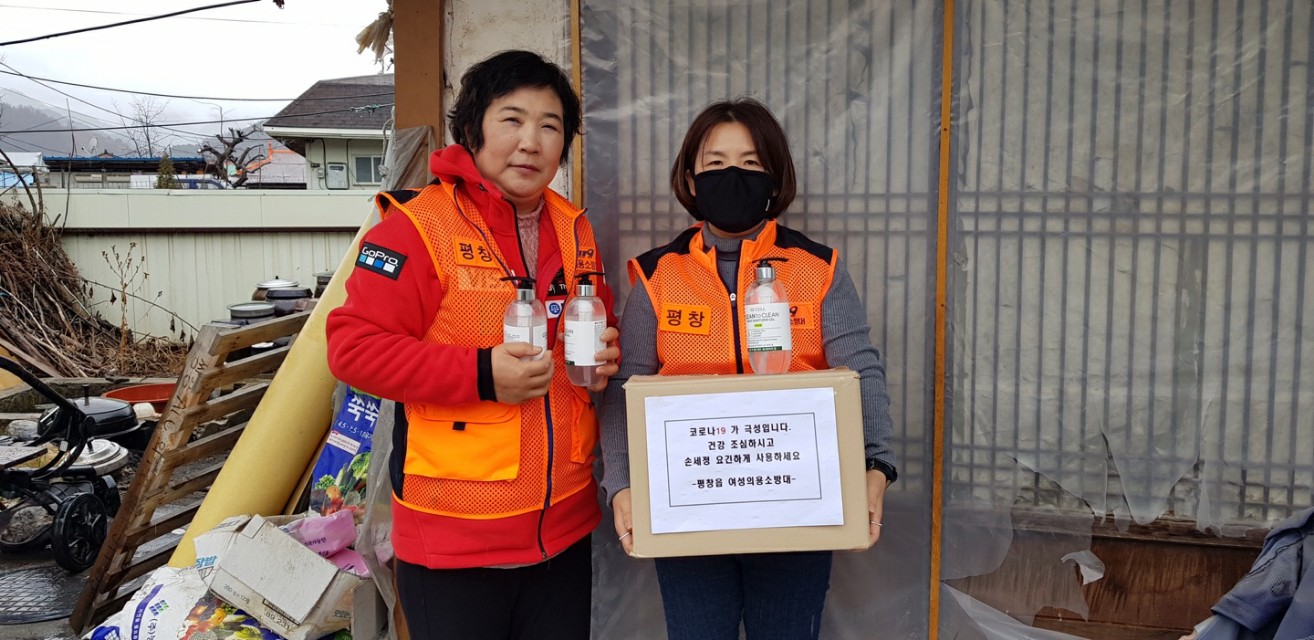 평창여성의용소방대는 10일 관내 독거노인 20가구를 대상으로 코로나19의 급격한 확산으로 인해 철저한 개인위생 관리가 중요해짐에 따라 비대면으로 손 소독제를 전달했다.