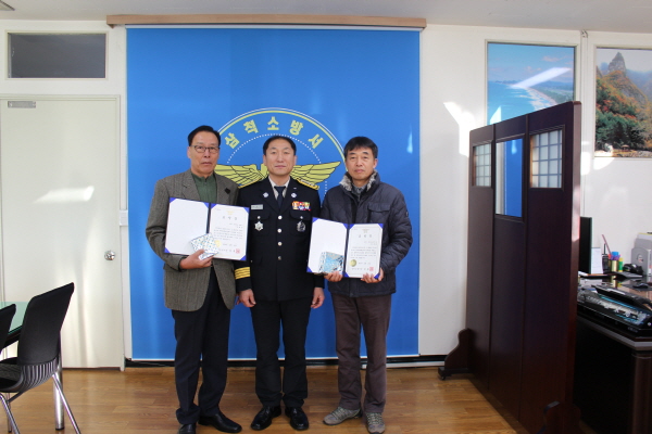 표창수여자 김효준(남, 56세), 박재문(남, 48세)씨는 지난 7일 오전 11시30분경 동막리 주택화재를 초기에 발견하여 주택에 거주중인 80대 노부부를 안전히 대피시키고, 인접야산으로 불이 확대될 상황을 미연에 방지하여 큰 피해를 막는 등 솔선수범하여 화재진압활동에 임하였다.