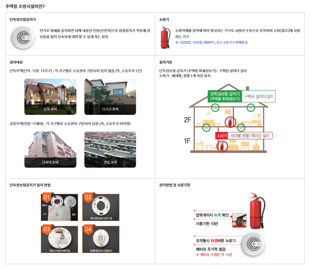 주택에 설치하는 소방시설 중 소화기는 가구당 1개(2층 이상일 경우 층별 1개씩), 단독경보형 감지기는 거실 또는 방마다 1개씩 의무적으로 설치해야 한다.