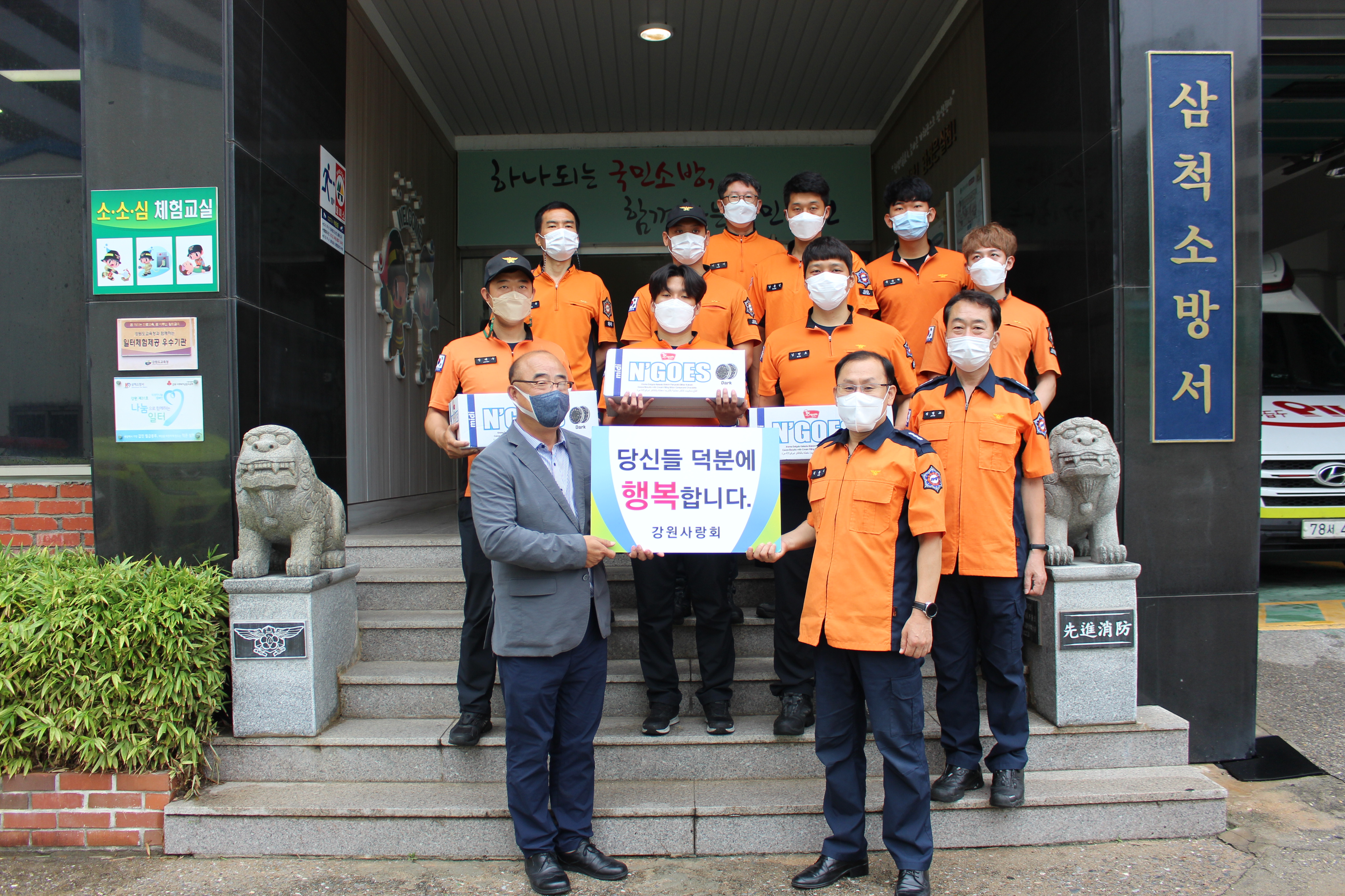 이 날 삼척소방서를 직접 방문한 이호 강원사랑회 사무총장은 강원도민의 안전을 위해 구슬땀 흘리는 소방관들을 격려하기 위해 초코바 세 박스를 전달했다.