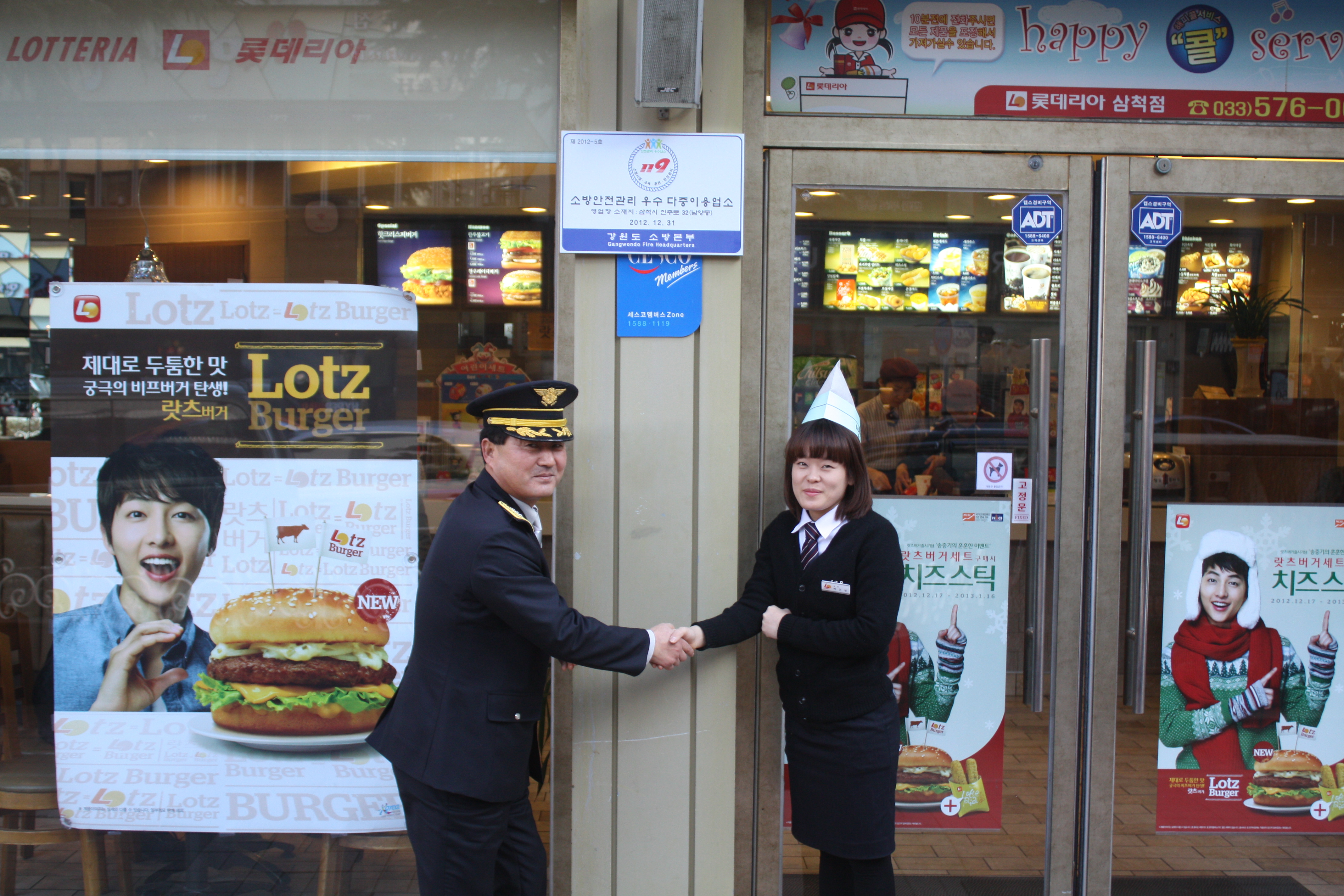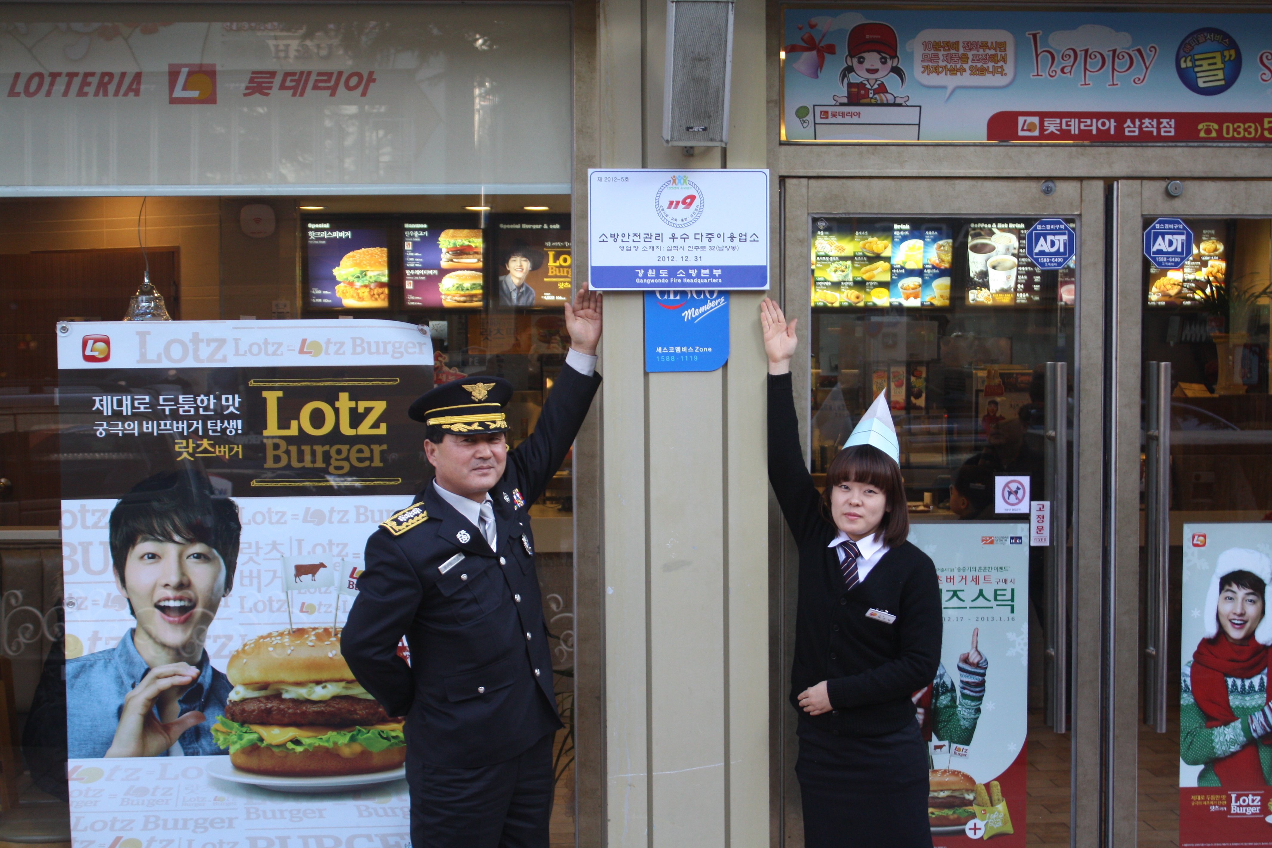 ▲ 삼척소방서(이지만 서장)는 지난 7일 15시 롯데리아 삼척점을 방문하여 2012년 소방안전관리 우수다중이용업소 인증표지판을 설치하였다.