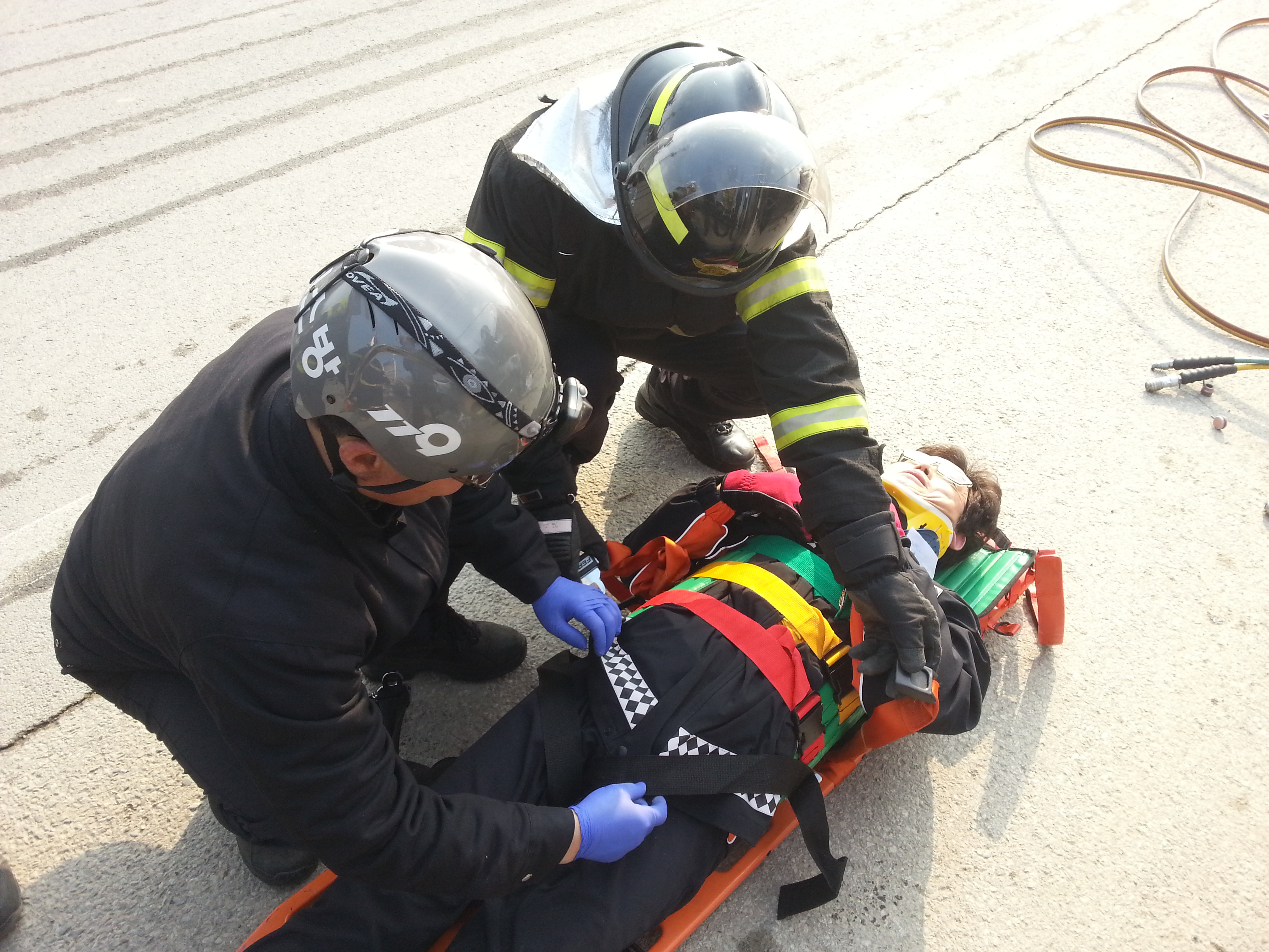 이번 훈련은 교통사고 전복 상황을 가정하여 ▲ 사고차량의 파손된 유리 등 장애물 안전제거요령 ▲ 구조장비 조작 및 사용법 교육 ▲ 교통사고 피해자 손상 기전 파악과 응급처치 교육 ▲ 기타 교통사고 인명구조훈련 관련 안전교육 등의 순으로 진행됐다.