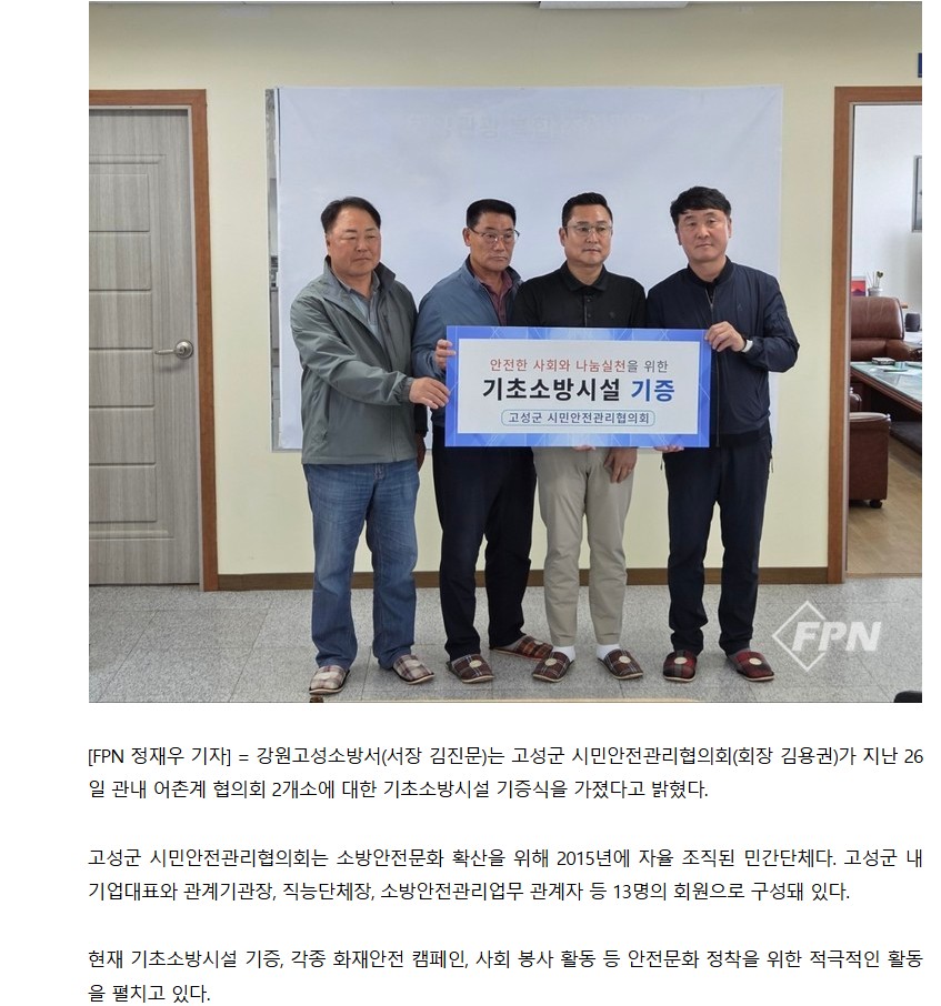 고성군 시민안전관리협의회(회장 김용권)는 어촌계 창고시설의 화재예방을 위하여 26일 고성군 관내 어촌계 협의회 2개소(고성군수협, 죽왕수협)에 소화기 등 150만원 상당의 기초소방시설을 기증하였다.