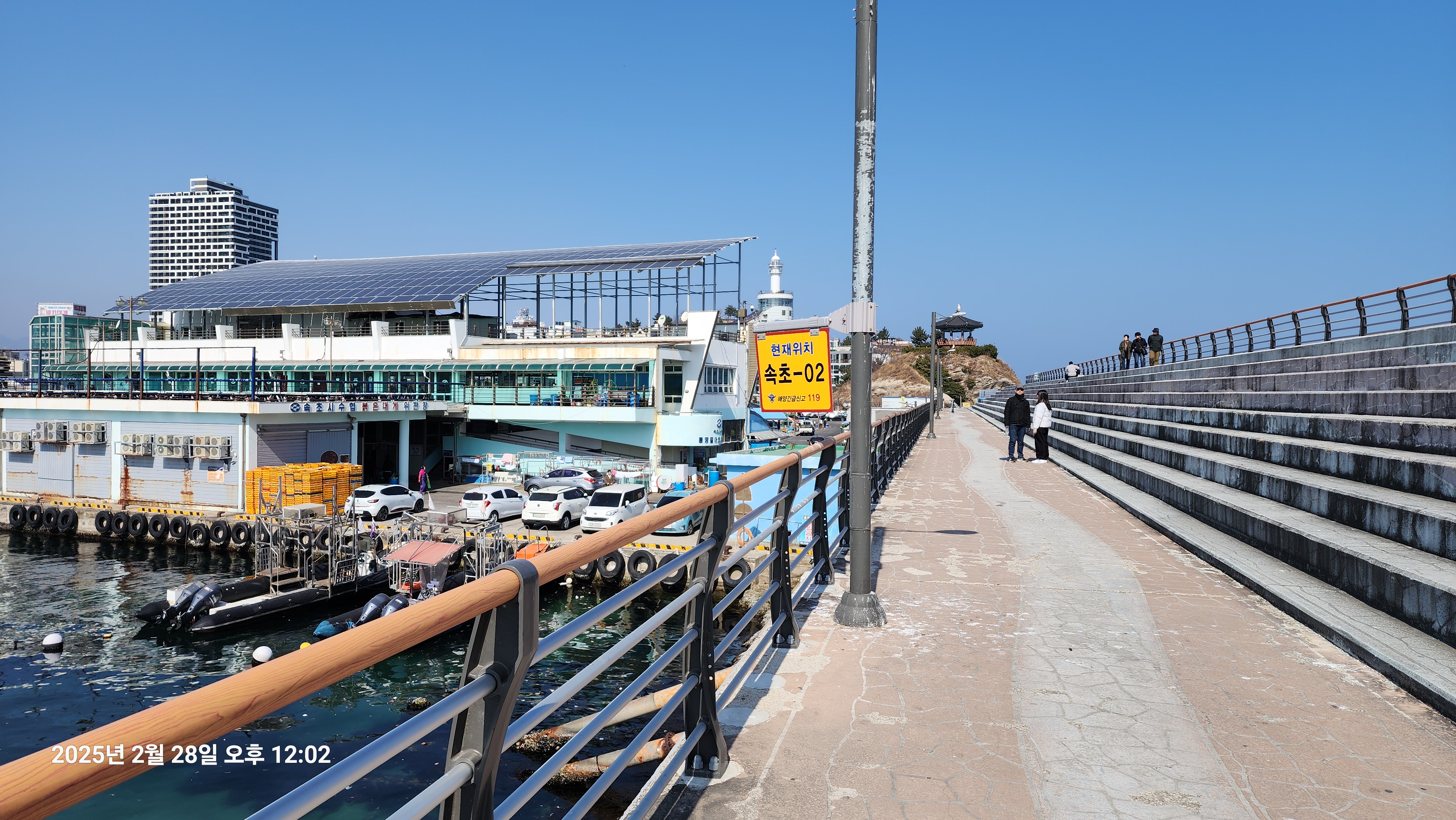 속초 동명항 방파제 초입에 119 안내표지판이 아래로 흘러 관광객인 제가 아래 바다를 구경하면서 가다