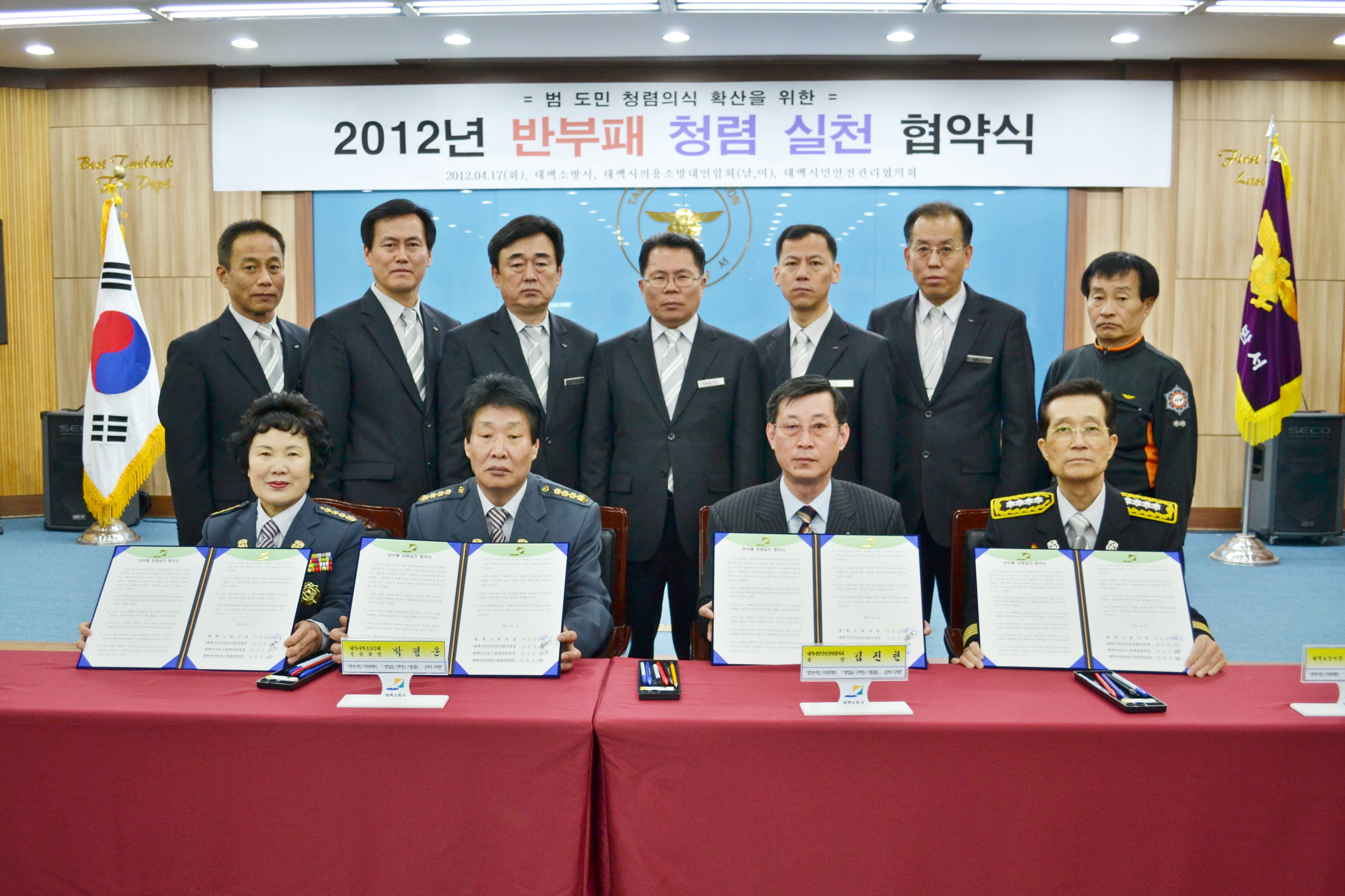 태백소방서(서장 여윤길)는 17일(화) 오전 10시 소방서 3층 대회의실에서 태백시민안전협의회(회장 김진현), 태백남여의용소방대연합회(회장 박정운, 하태연)와 범도민 청렴의식 확산을 위한 「반부패?청렴실천」 협약식을 가졌다.