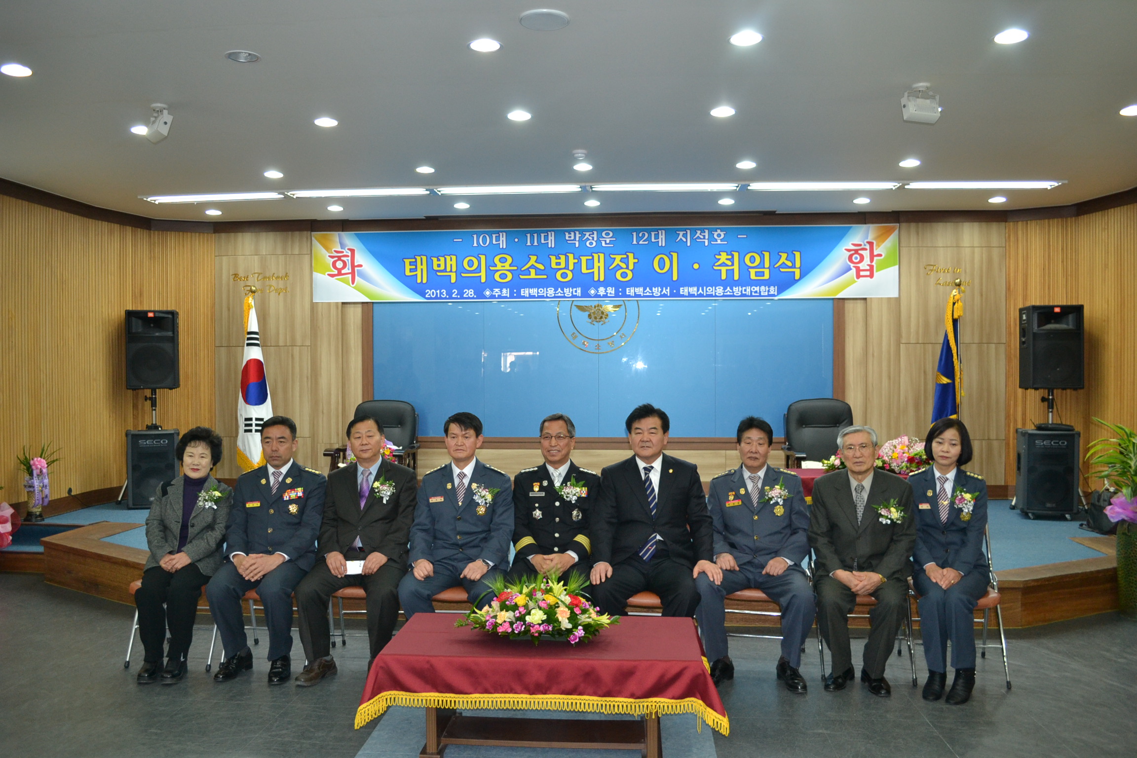 태백소방서(서장 김진봉) 는 2013. 2. 28(목) 11시 태백시 부시장님, 도의원님, 시의원님 등 각 기관단체장 및 소방공무원, 의용소방대원 등 110여명이 참석한 가운데 태백의용소방대장 이.취임식 행사를 가졌습니다.