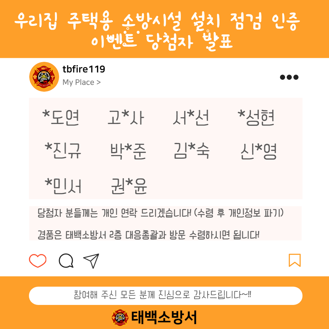 5월 가정의 달을 맞아 우리집 주택용 소방시설 설치 점검 인증 이벤트 당첨자를 발표합니다~!!