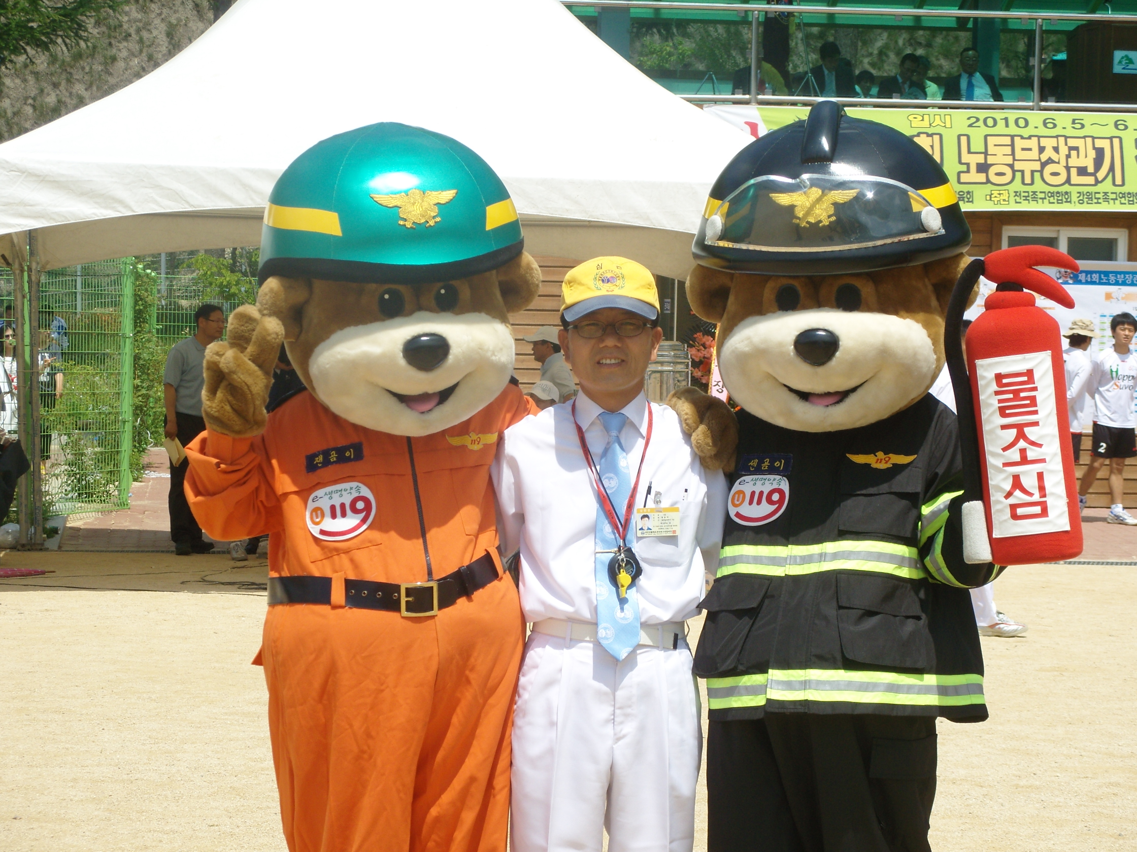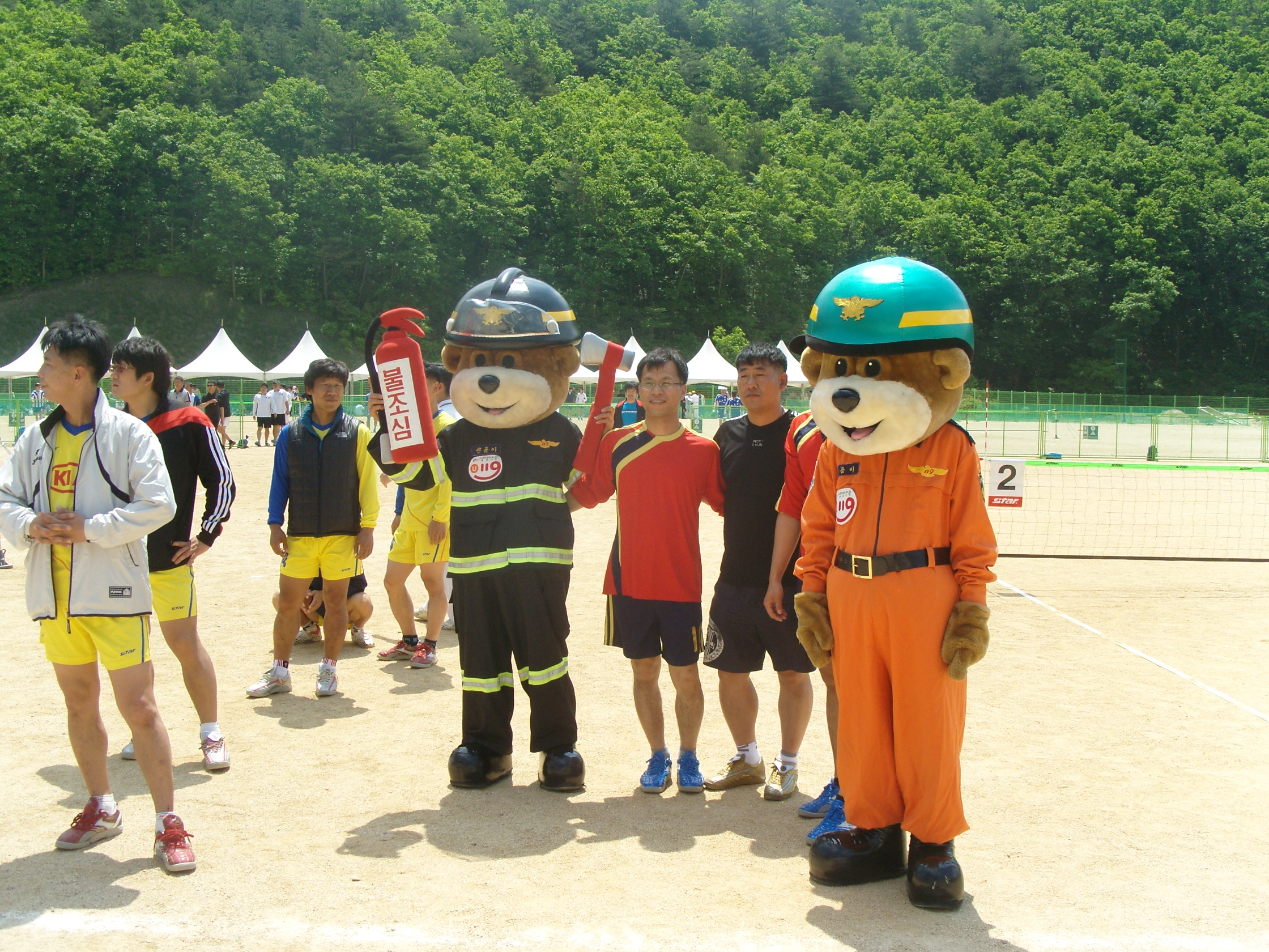 태백소방서 족구팀은 6월 5일(토) 제4회 노동부장관기 전국직장근로자 족구대회에 참석하여 입장식에서 센곰이와 잰곰이 캐릭터를 활용한 소방홍보를 실시했다.