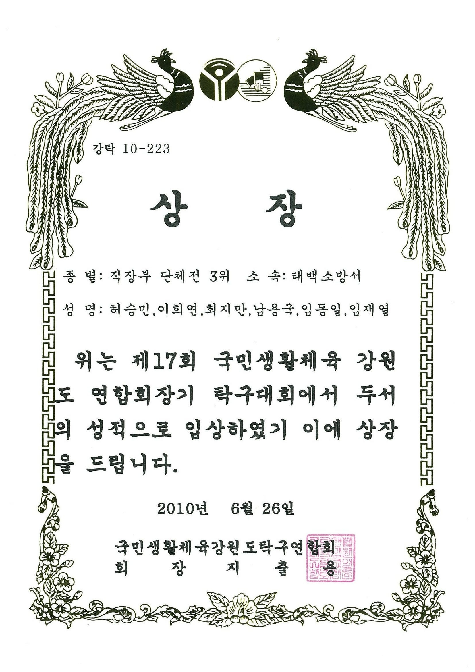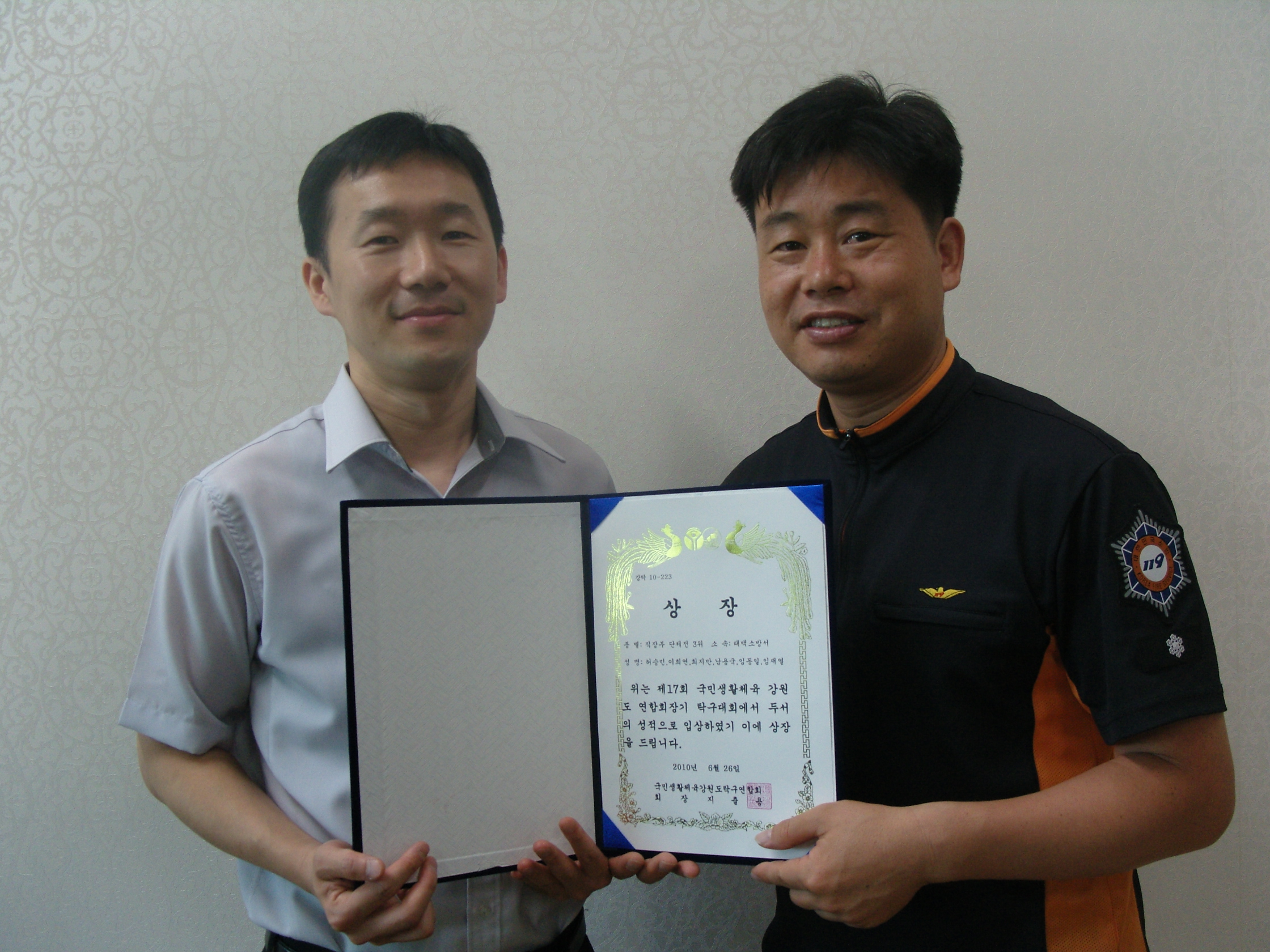 태백소방서 탁구팀(감독 : 황재식, 선수 : 허승민, 이희연, 최지만, 남용국, 임동일, 임재열)이 6월 26일 열린 제17회 국민생활체육 강원 연합회장기 탁구대회에서 직장부 단체전 3위의 우수한 성적으로 입상했다.