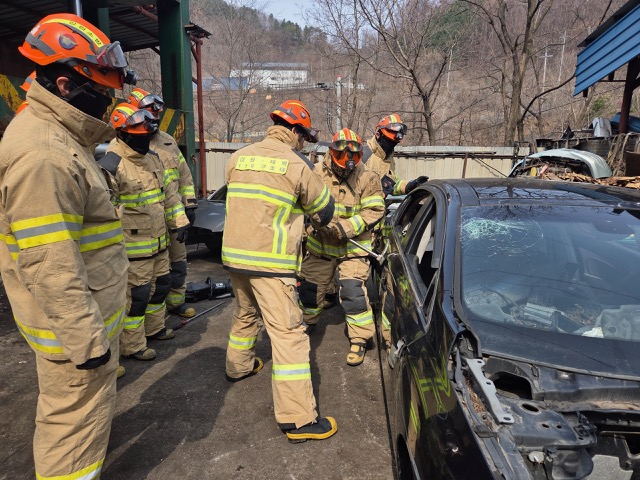 태백소방서는 3월 25일 강원종합폐차장에서 교통사고 현장 대응능력 강화를 위한 인명구조훈련을 실시했습니다.