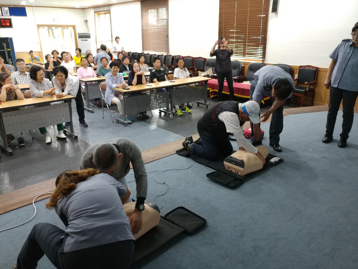 주요 내용은 ▲심폐소생술 및 자동 심장충격기 사용법▲기본 응급처치교육 ▲강원119신고 앱 설치 및 사용법 ▲ 주택용 소방시설 설치관련 홍보 등으로 진행됐다.