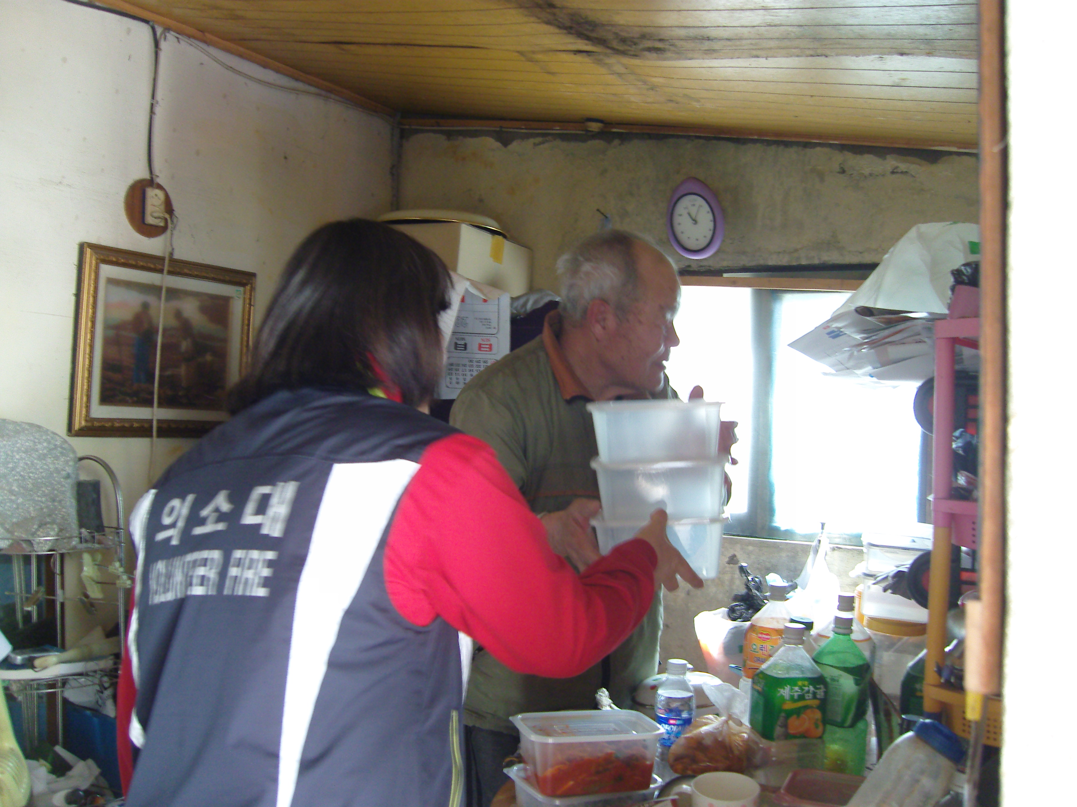 안 여러 어르신들께서 반찬을 드시고 용기를 모아 재활용 할