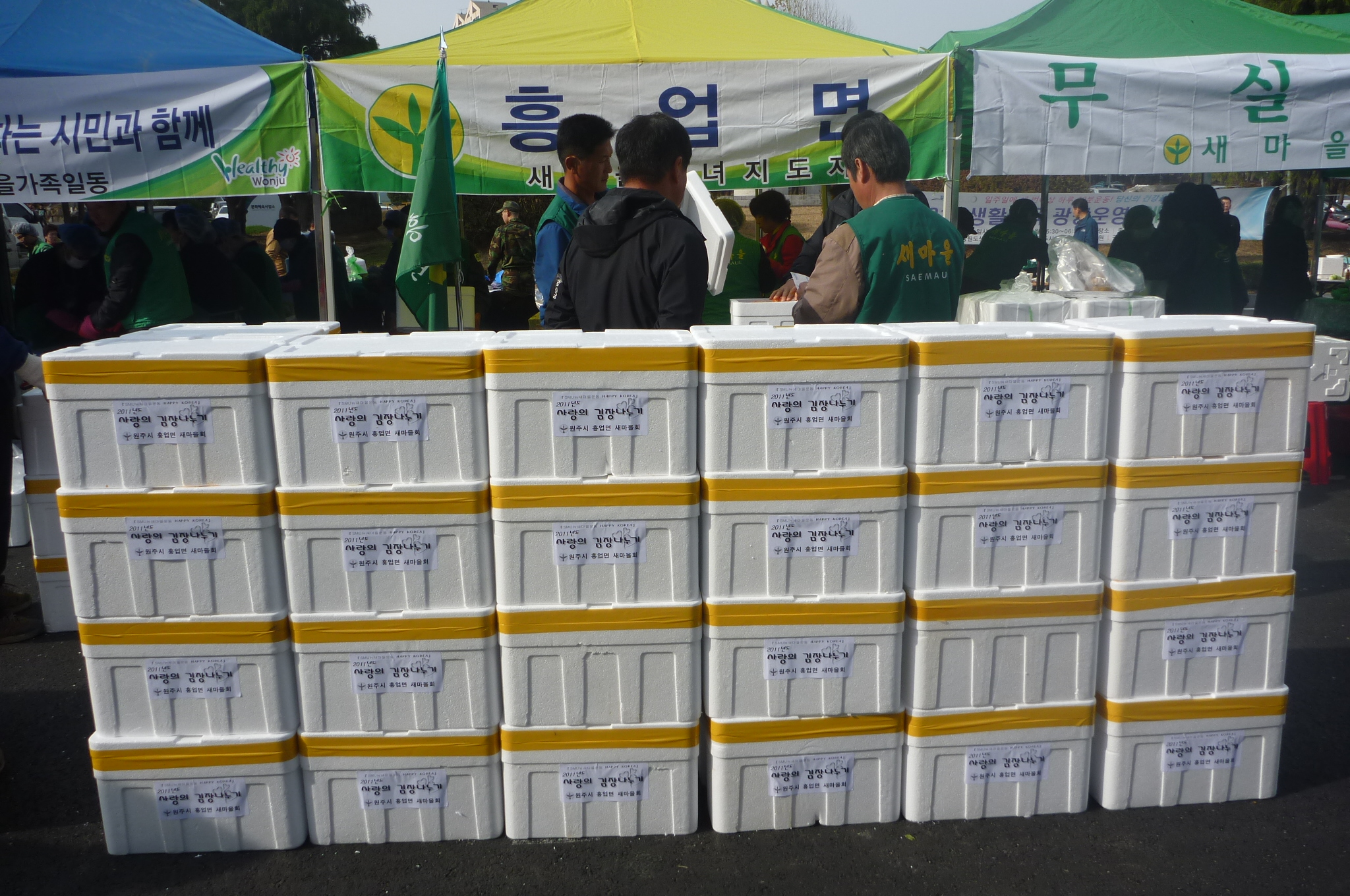 저희 흥업여성대(대장오오석)에서는 "2011년 원주시 새마을회 김장담그기행사" 에 다녀왔습니다. 11월10일 10:00~14:00까지 공설운동장 정문에서 대장외3명이 함께 격력금 전달과 봉사를 하고 왔습니다.