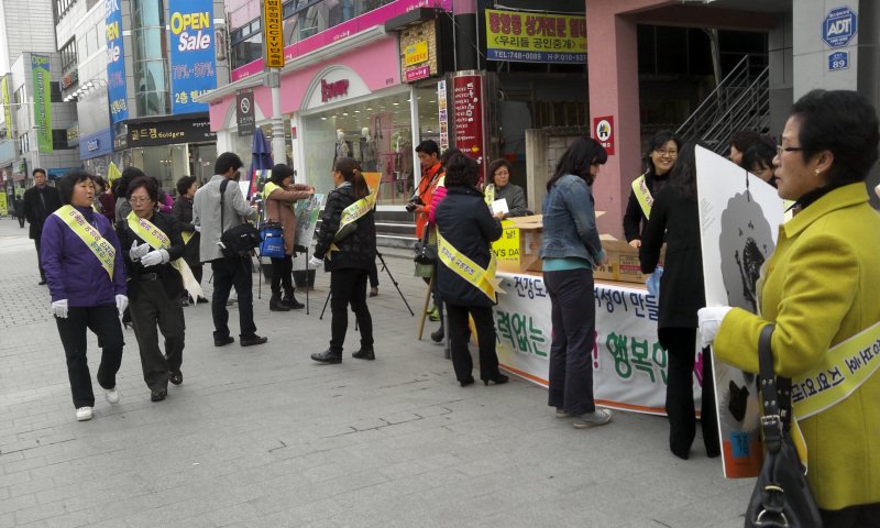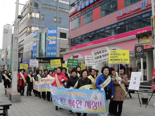 이날 행사는 양성평등과 아동·여성폭력예방 포스터 60여점을 전시하고, 시민들에게 폭력예방을 위한 리플릿과 호신용 경보기를 나눠주며 폭력예방캠페인을 하였습니다. 또한 젊음의 광장에서 시작하여 지하상가 사거리, 강원감영, KBS방송국을 거쳐 젊음의 광장으로 돌아오는 거리행진캠페인도 병행하며 성매매 없는 사회, 폭력 없는 사회를 외쳤습니다.