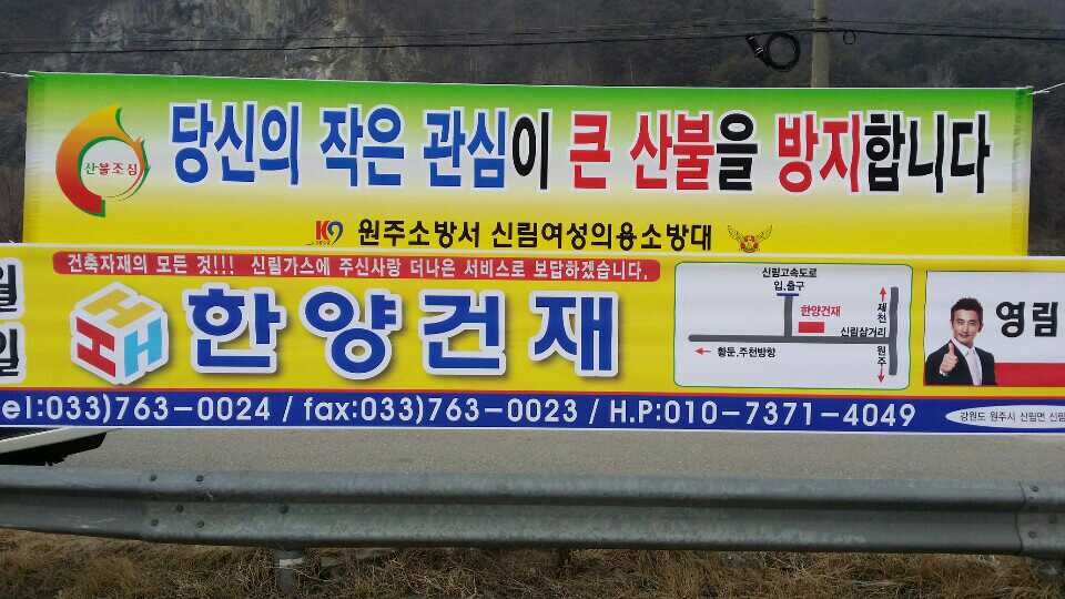 신림 남,여 의소대에서는 신림I.C앞과 연봉정마을 입구에 산불조심 현수막을 설치하였습니다.
