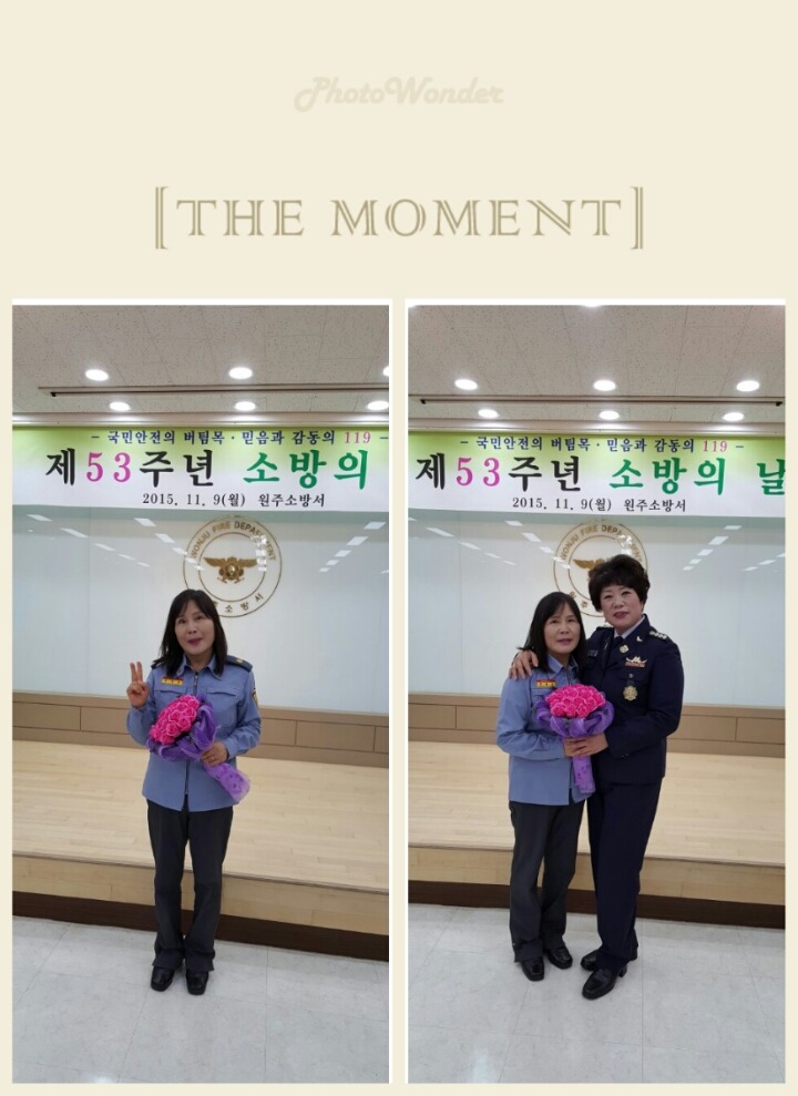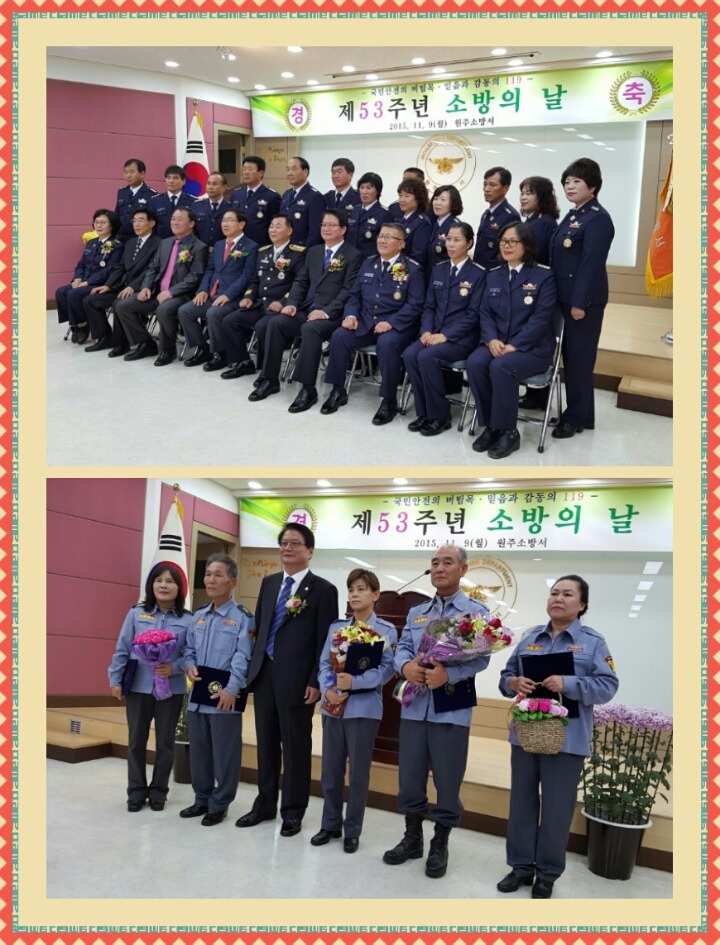 2015년11월9일 월요일 명륜센터에서 53주년 소방의날 행사에 김영연대장님 이미자총무부장님 참석하셨습니다 이날 원주시장상에 김정옥반장님이 수상하셨습니다