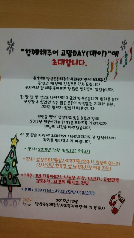 2015년 12월18일 금요일 3시부터 뜻깊은 자리에 이미자총무부장님 천영덕부장님 김찬희반장님 안금향대원 김용자대원 참석 하여 한해 밥상공동체에 봉사해주신 각 봉사단체에 있는분들과 함께 하는자리에 다녀 오셨습니다^^~~~