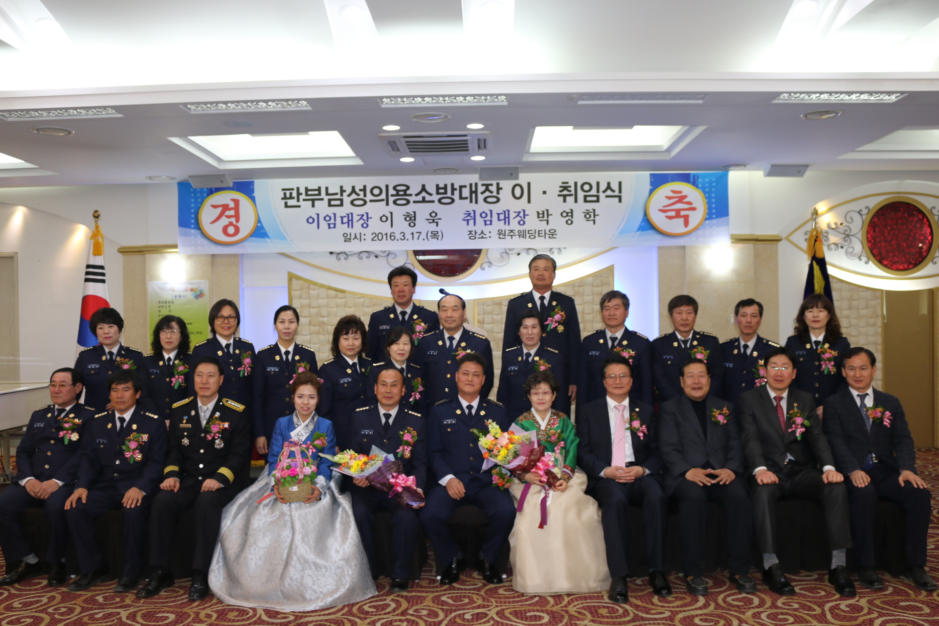 원주소방서(서장 진형민)는 17일 오후 5시 원주웨딩타운에서 주요 내빈 및 지역사회 주민 등 100여명이 참석한 가운데 이임 이형욱 취임 박영학 판부남성의용소방대장의 이․취임식을 가졌다.