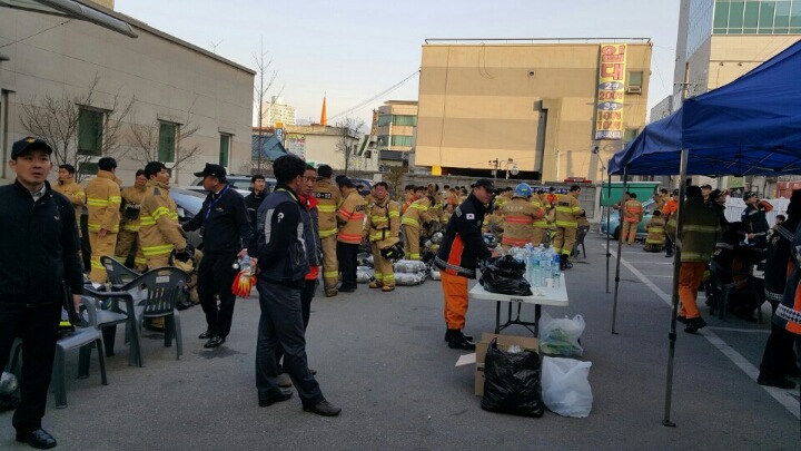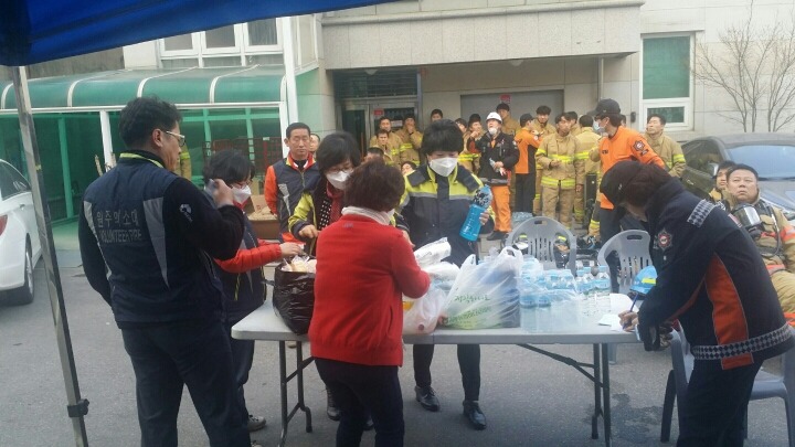 2016년 3월18일 금요일 중앙시장 한가운데 있는 관광호텔에서 화재가 발생하여 김영연대장외 대원분들이 동참하여 봉사의 손길이