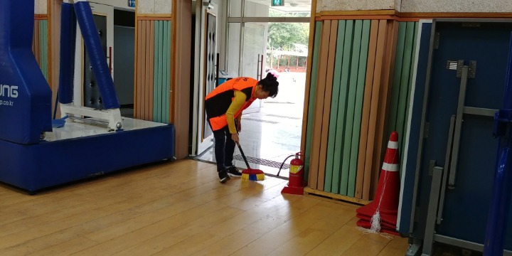 내용:체육관실내 바닥청소 및 입구 먼지 제거 쓰레기분리수거