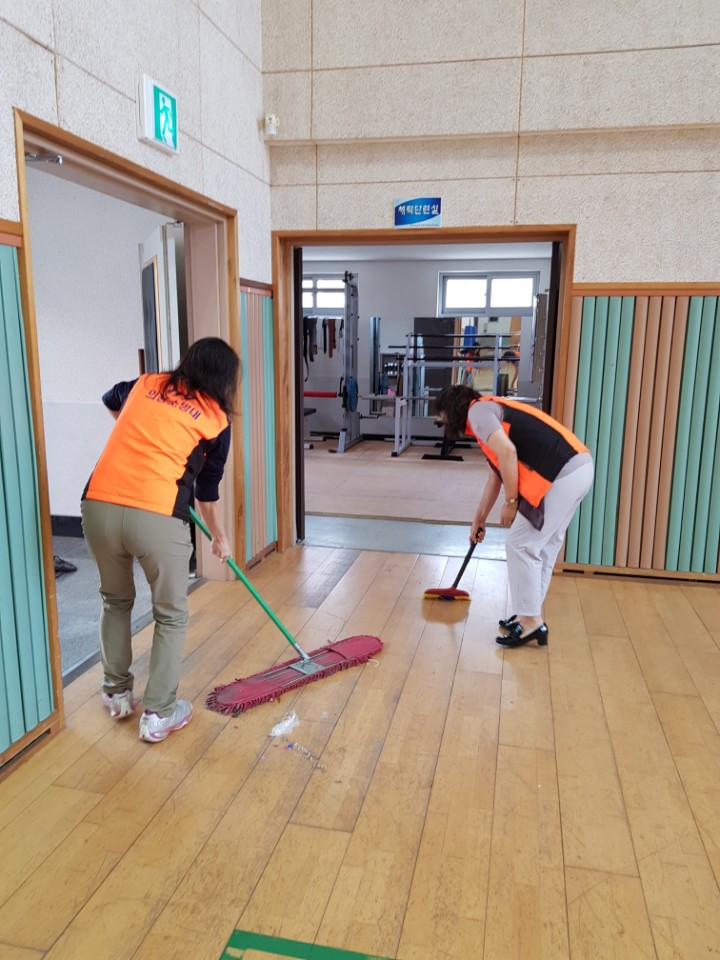 내용:체육관실내 바닥청소 및 입구 먼지 제거 쓰레기분리수거