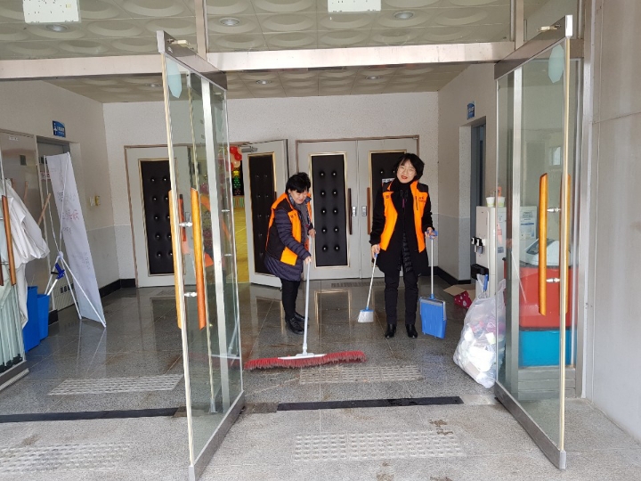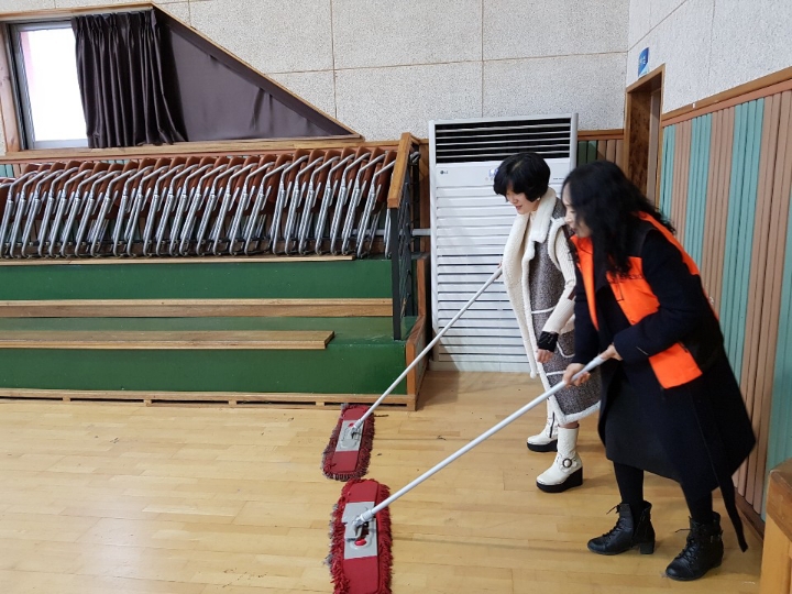 내용: 체육관 실내 바닥청소 및 입구먼지제거 쓰레기분리수거