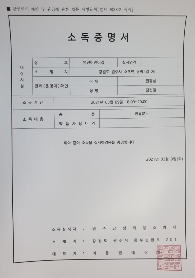 방역장소 : 영진어린이집 , 예라어린이집