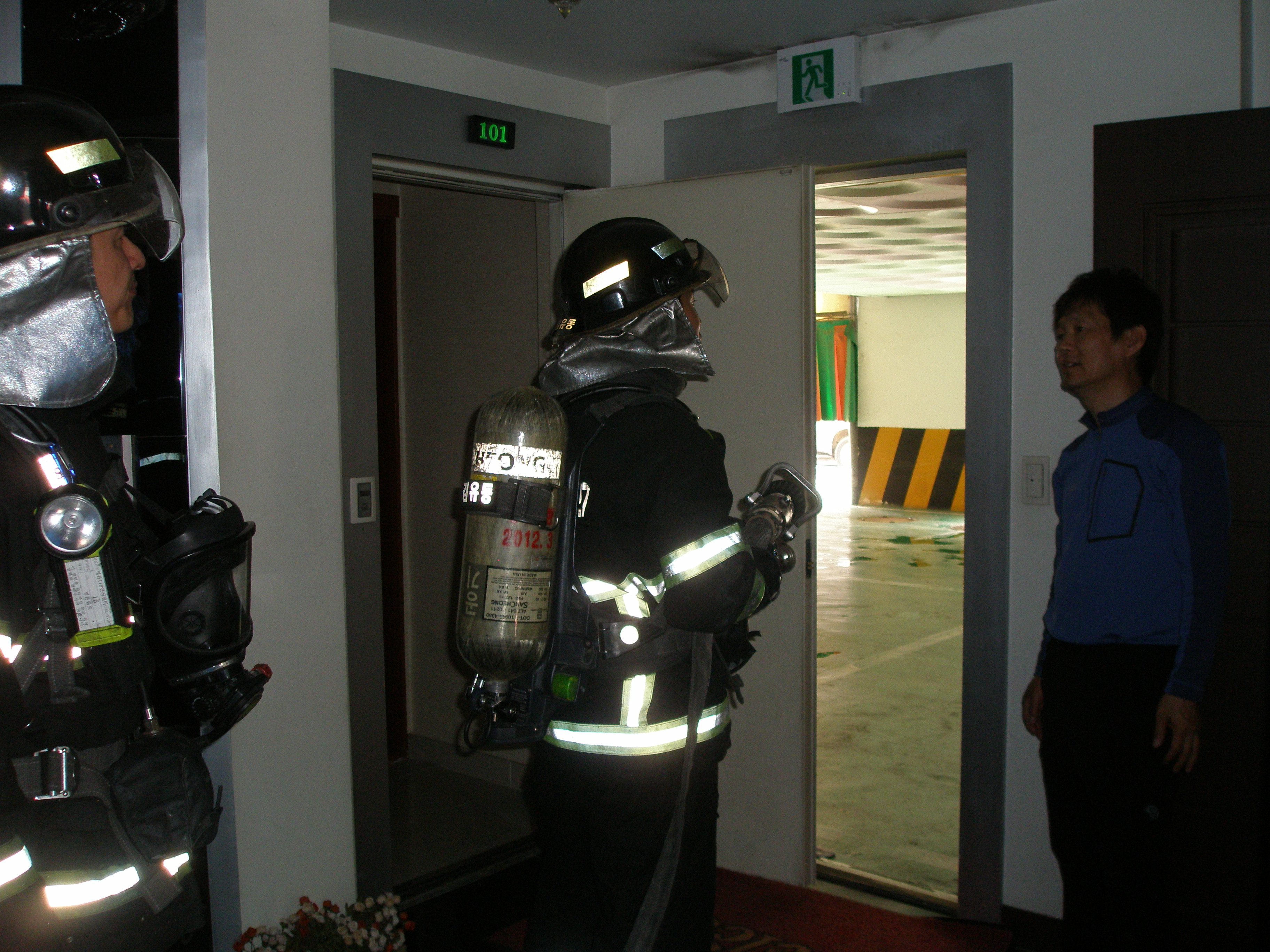 1층 투숙실을 가상화점으로 진행된 이번훈련에서는 명륜119안전센터 직원들의 진입로 확인 및 비상탈출 통로 등 건물구조 숙지와 화재취약지점 확인 등 현장대응능력을 점검하는 것에 중점을 두었고, 로즈힐 모텔 관계자들에게 소화기 사용법 및 비상탈출법 등 소방안전교육을 실시하였습니다.