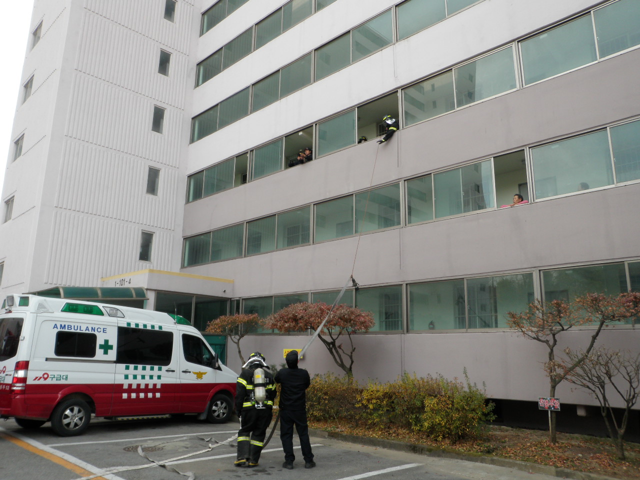이번 훈련은 고층건물 화재시 인명검색 및 요구조자 대피유도 위주로 훈련을 실시했습니다.
