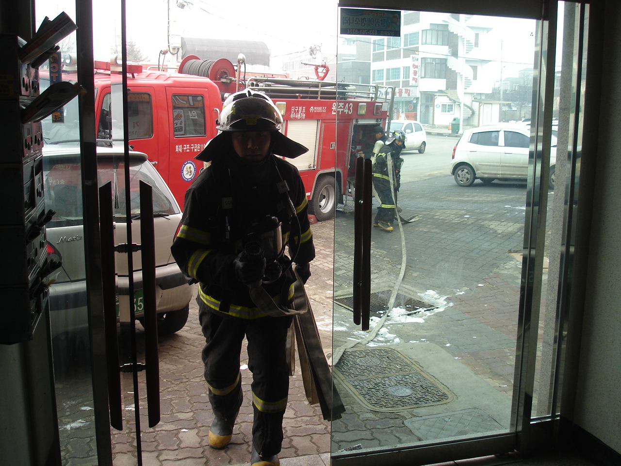 금일 훈련은 가상화점을 부여해 신속한 출동으로 인명대피유도 및 가상화점에 집중방수하여 초기화재진압에 목적을 둔 훈련입니다.
