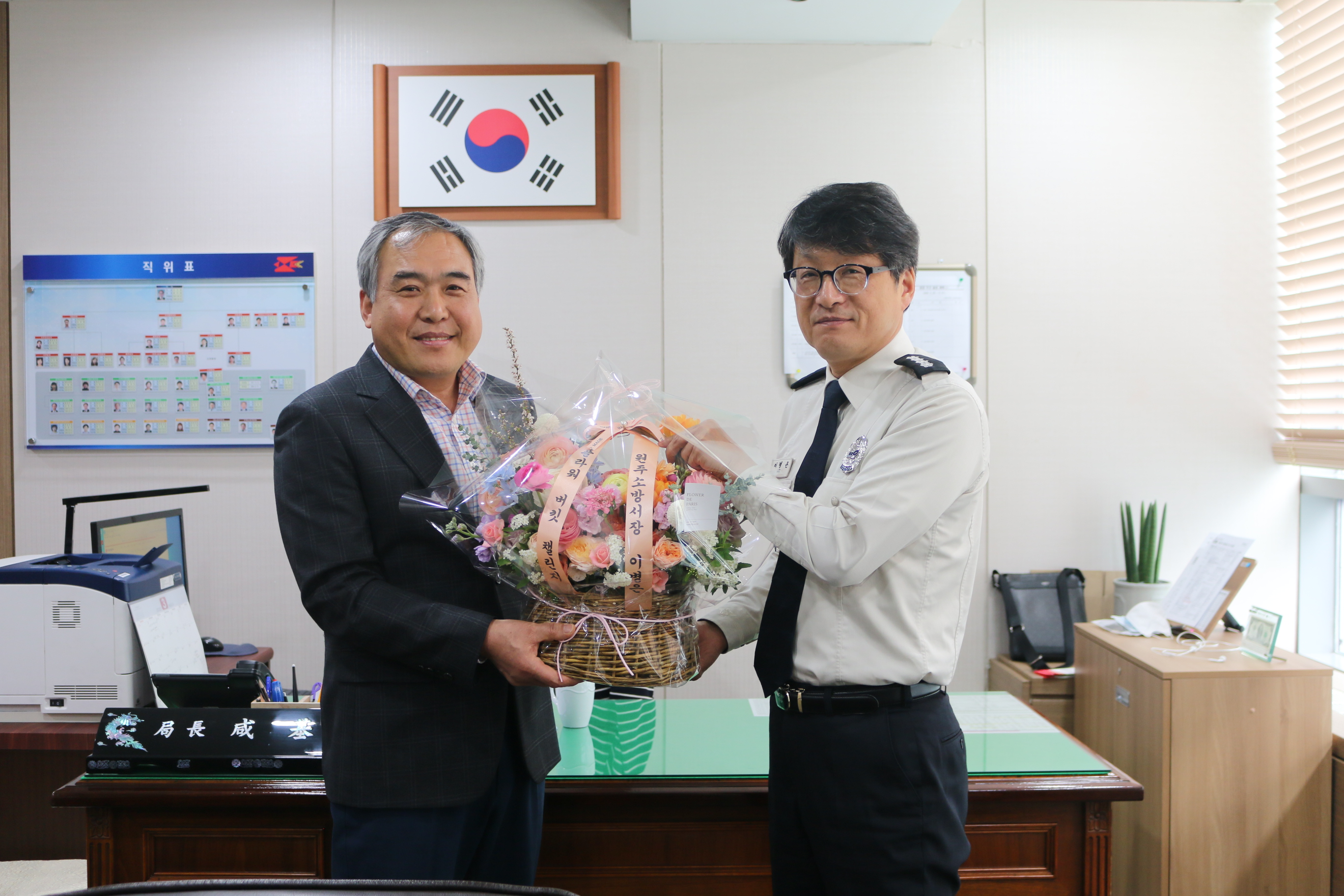 | 3217 | 이병은 원주소방서장,‘플라워버킷챌린지’ 함기철 원주우체국장에 꽃바구니 전달 | 원주홍보 | 2020-03-27 | 1264 | |