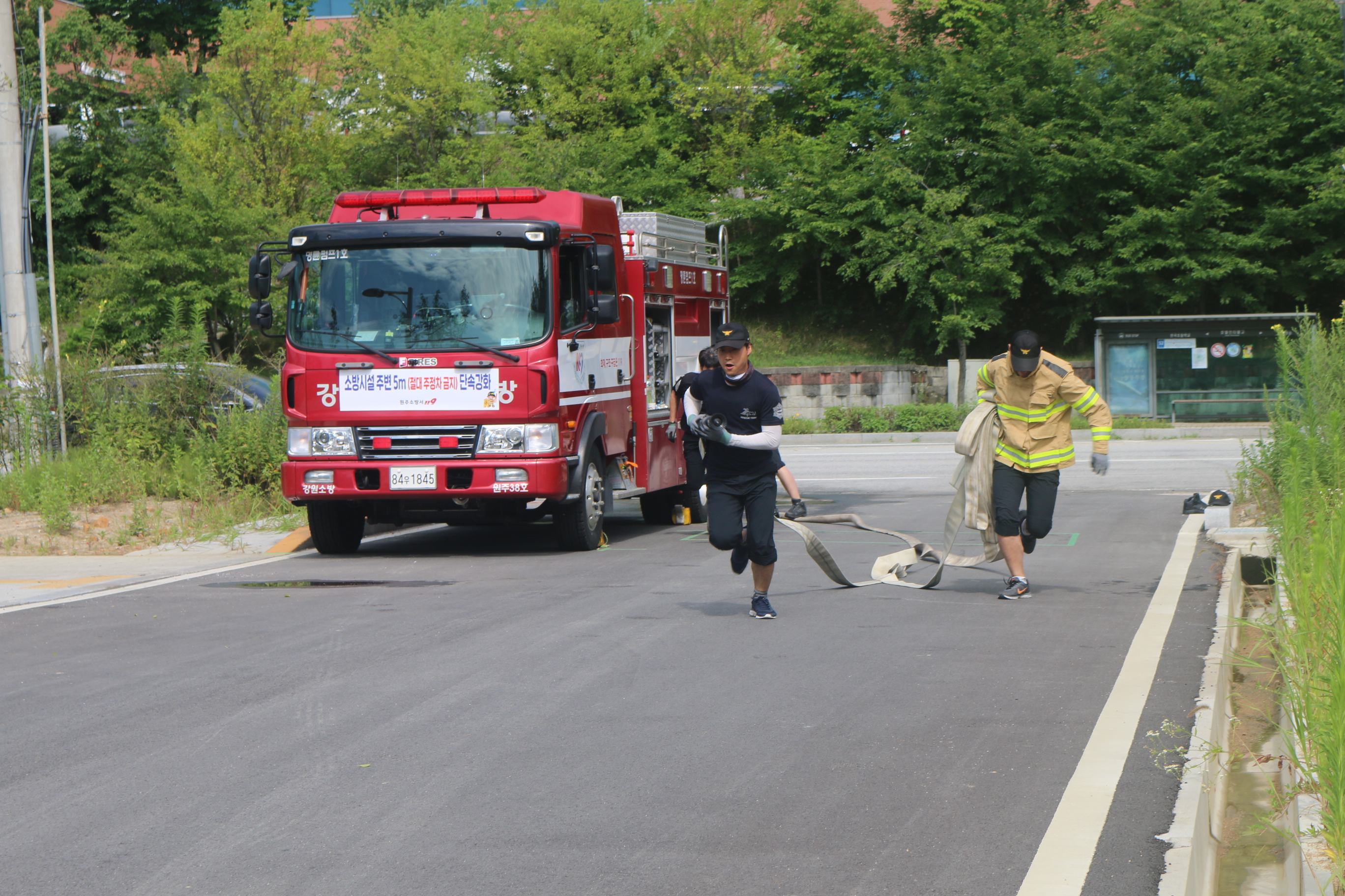 제33회 전국소방기술경연대회 화재분야(속도방수)에 원주소방서 대표로 출전하는 출전팀이 맹훈련중인 모습입니다.
