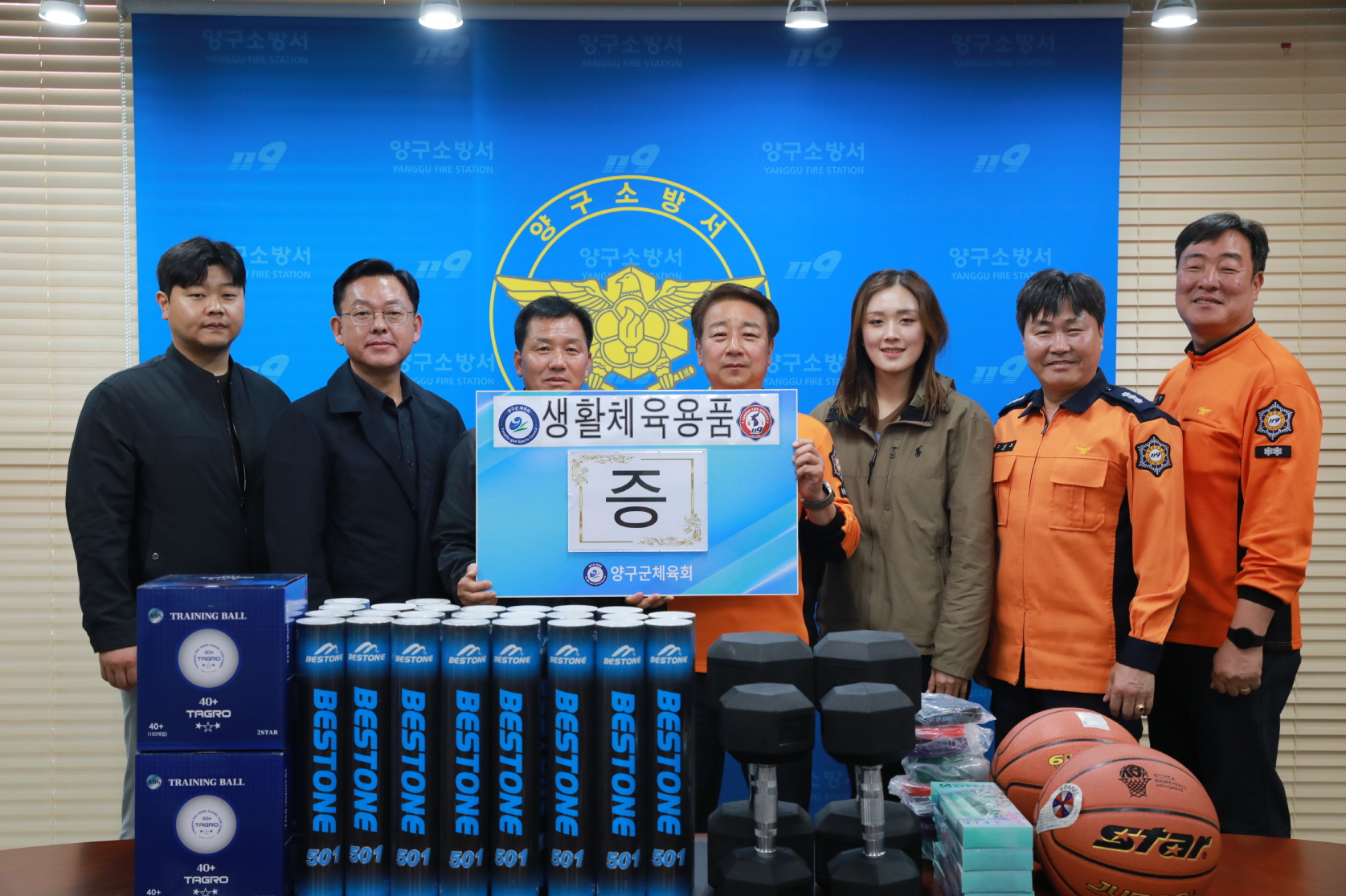 탁구공, 농구공, 아령, 줄넘기, 배드민턴 셔틀콕 등 다양한 생활체육용품을 한가득 선물해 주시며, 양구소방서 직원들을 포함, 양구군민의 건강을 챙기기 위한 따뜻한 마음을 전해 주셨습니다.