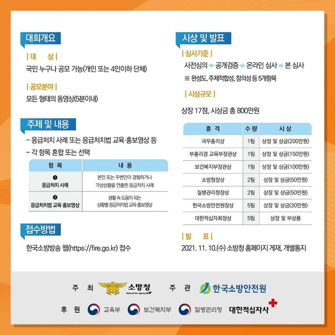 - 공모주제: 응급처치 사례 또는 응급처치법 교육·홍보영상 등