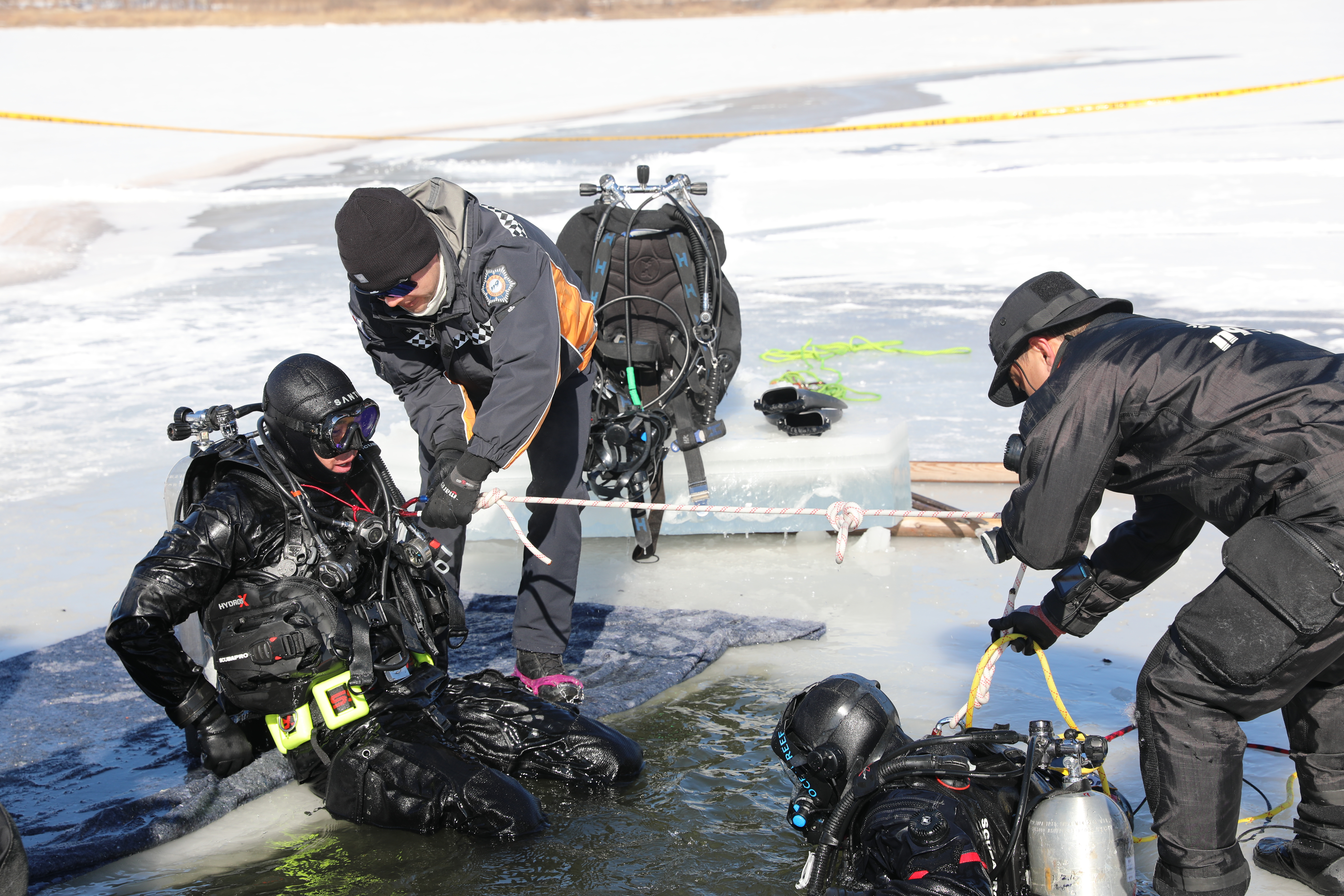 양구119구조대원들은 영하 20도를 넘나드는 혹독한 날씨에도 얼음층을 뚫고 진지하게 훈련에 임했습니다.