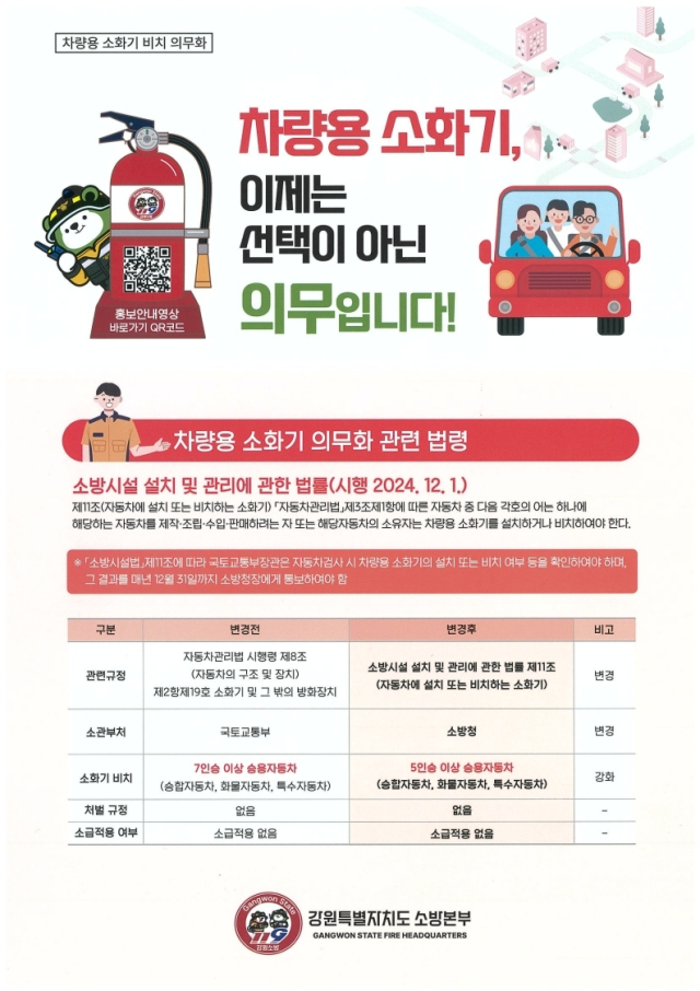 소방서는 지난해 12월1일 '소방시설 설치 및 관리에 관한 법률' 개정안이 시행됨에 따라 5인승 이상 차량에는 차량용 소화기 설치·비치가 의무화됐다고 밝혔다.