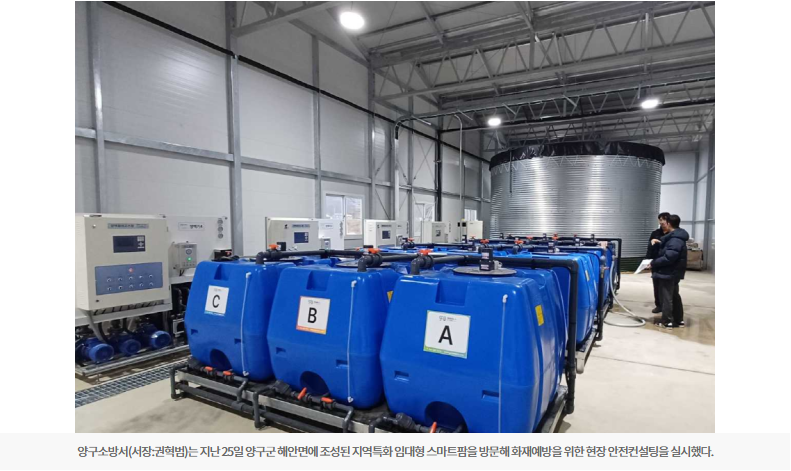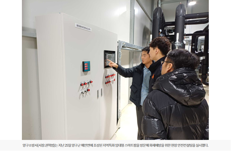 양구소방서(서장:권혁범)는 지난 25일 양구군 해안면에 조성된 지역특화 임대형 스마트팜을 방문해 화재예방을 위한 현장 안전컨설팅을 실시했다.