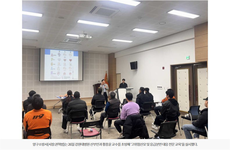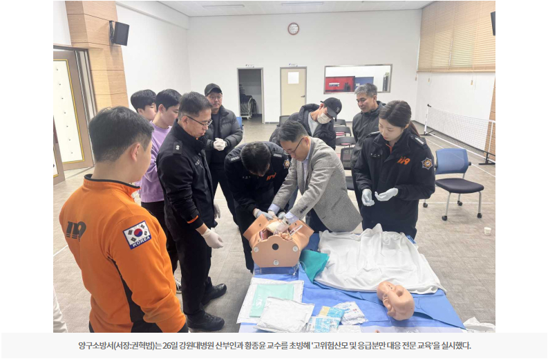 【양구】양구소방서(서장:권혁범)는 26일 강원대병원 산부인과 황종윤 교수를 초빙해 '고위험산모 및 응급분만 대응 전문 교육'을 실시했다.