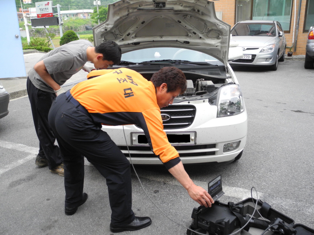 그래서 우리구조대원은 내시경카메라 장비를 이용하여 자동차 보닛을 열고 이곳저곳을 자세하게 보기로 했습니다. 내시경카메라는 병원에서 위 내시경할때 쓰이는 것하고 비슷하나 사람한테는 쓸수 없고 건물사이나 좁은 공간을 볼때 사용하는 장비 입니다.