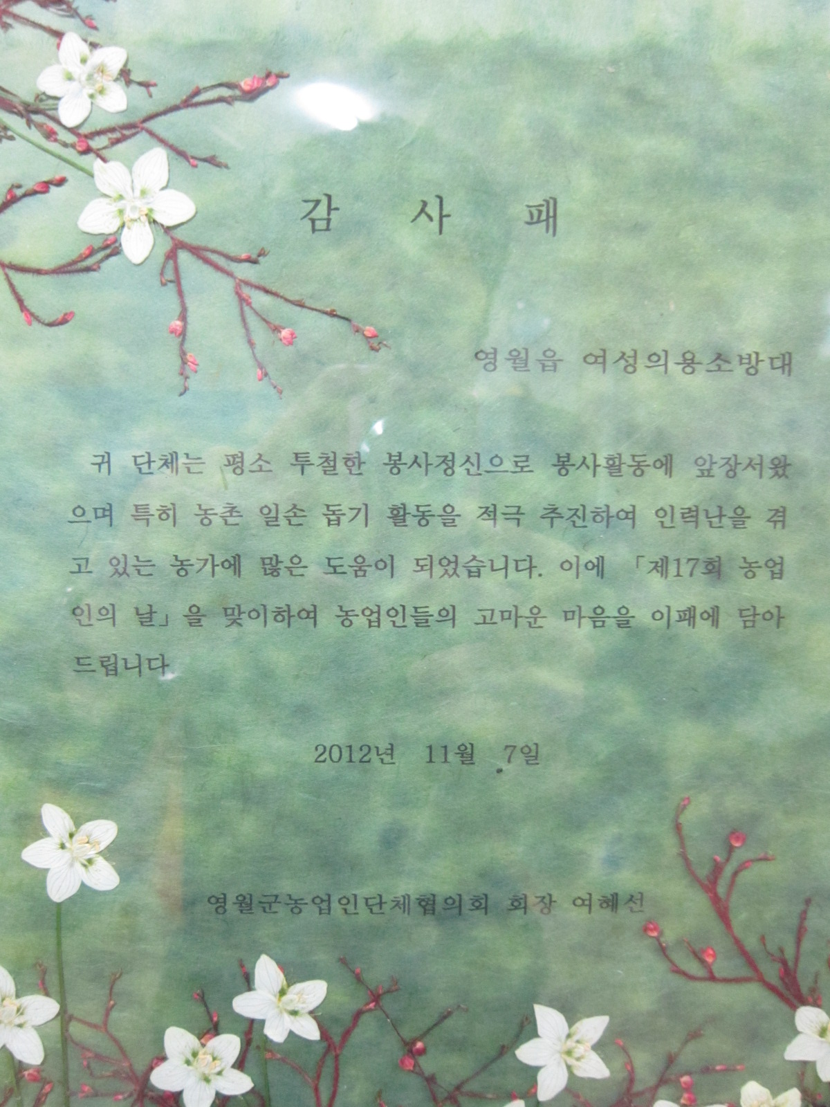영월의 농가에 많은 도움이 되었다는 공이 인정되어