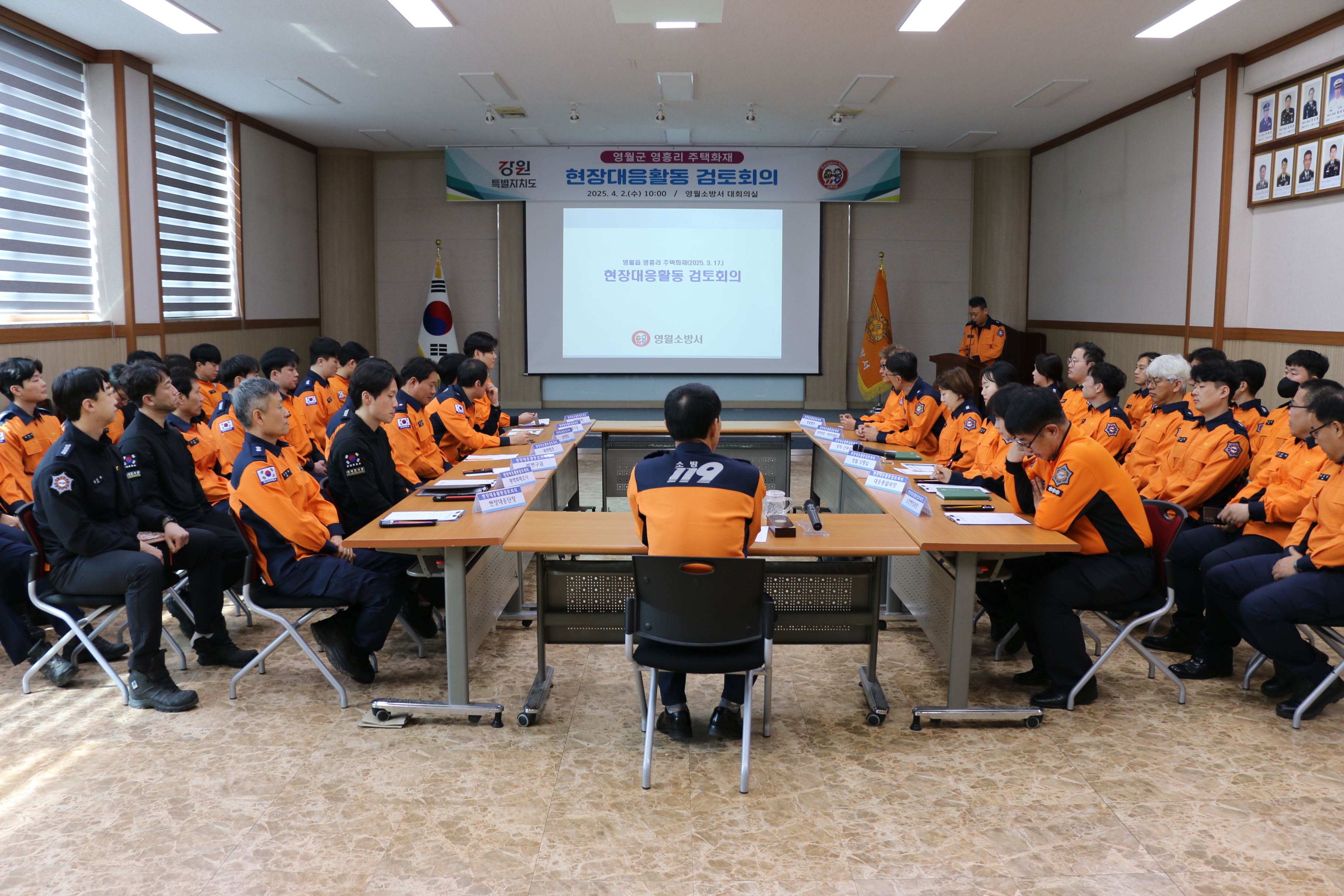 영월소방서(김동훈 서장)는 2일 본서 대회의실에서 김동훈 서장을 비롯한 소방공무원 40여 명이 참석한 가운데, 지난 3월 17일 영흥리에서 발생한 주택화재에 대한 현장대응활동 검토회의를 개최했다.