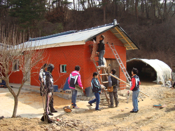 영월소방서 평창119안전센터 대화여성의용소방대에서는 지난 2010.04.01(목) 강풍에 지붕이 날아가 어려움을 겪고 있는 정신지체2급장애인 가구(신영호,35(남))를 09일 방문하여 지붕공사 대금 전달 및 직접 지붕을 공사하는 등 "봄 향기와 함께 사랑과 행복을 나누는" 봉사활동을 펼쳤습니다