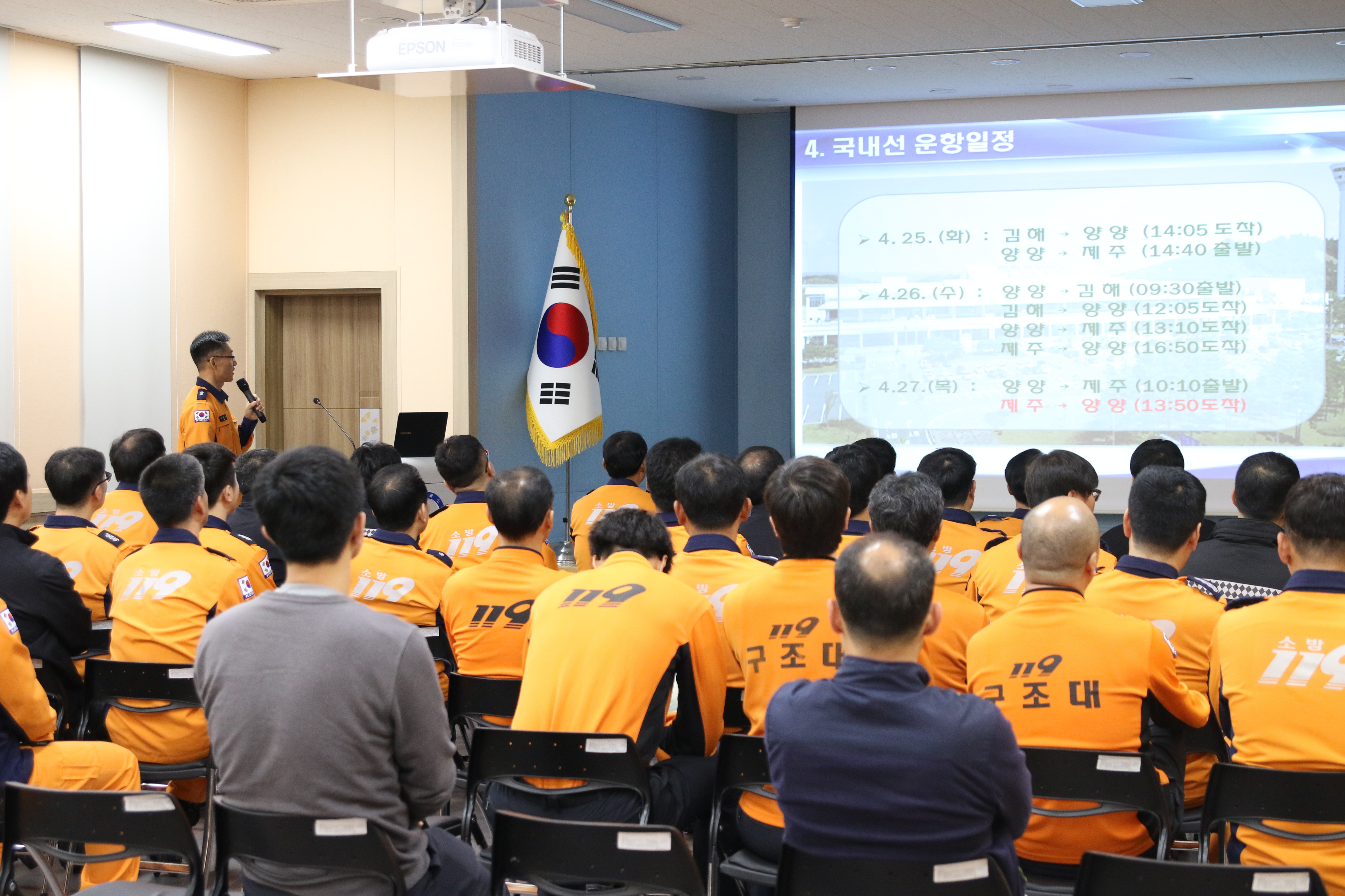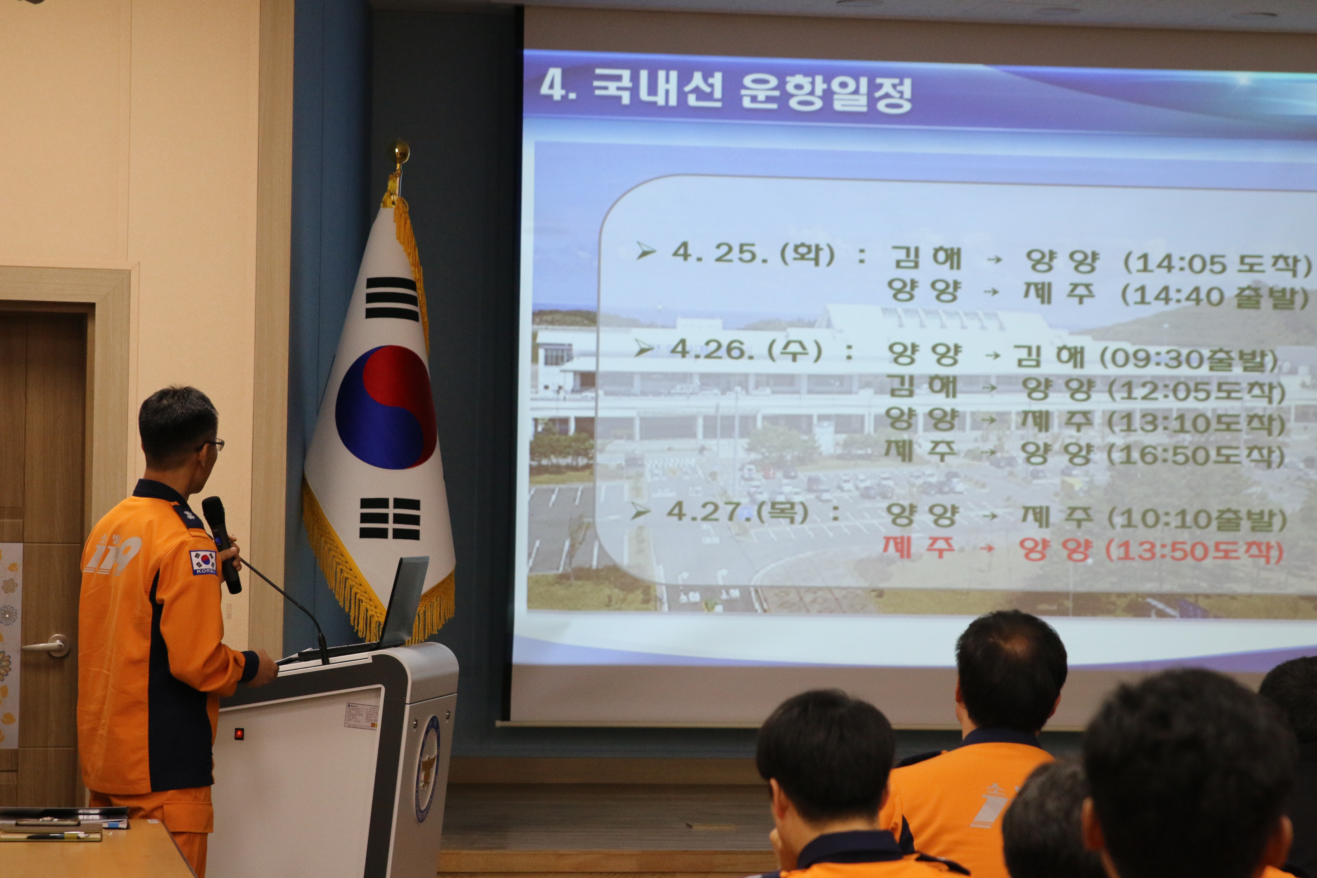 이날 훈련은 4월27일 양양국제공항에서 시행 될 긴급구조종합훈련을 대비한 소방훈련참가자들의 자체도상훈련이다. 구체적 내용으로는 항공기 불시착으로 화재가 발생하고 다수의 부상자가 발생한 상황에서 양양공항 승객을 신속하게 대피시키고 항공기 내 인명을 구조하며 인근 야산으로 연소 확대 된 산불을 진화하는 등의 내용으로 도상훈련이 실시되었다.
